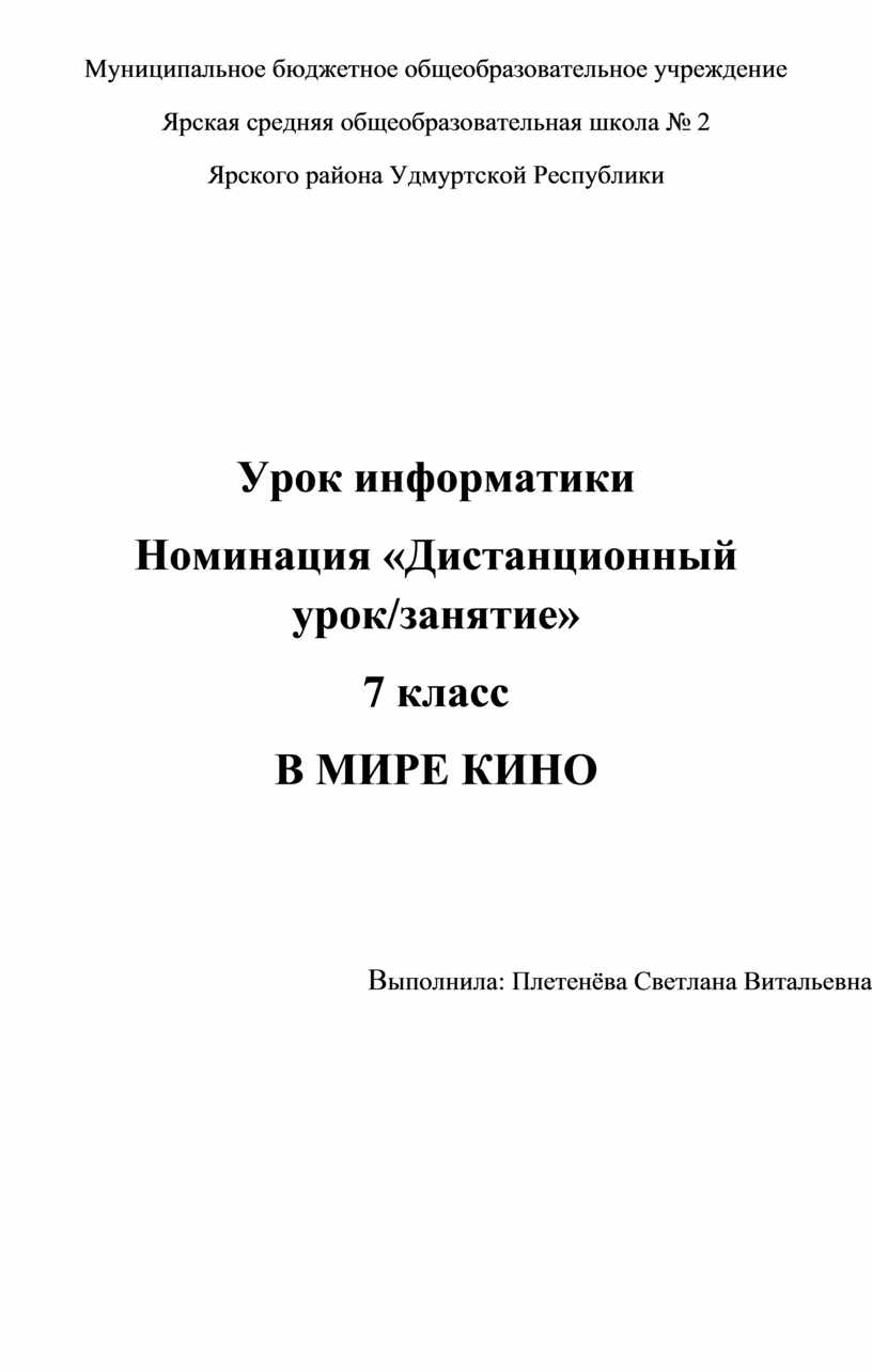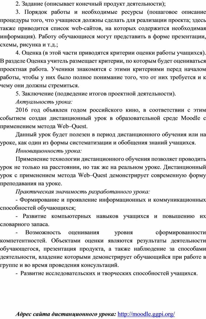 2016 год объявлен годом российского кино, в соответствии с этим событием создан дистанционный урок в образовательной среде Moodle с применением метода Web–Quest.