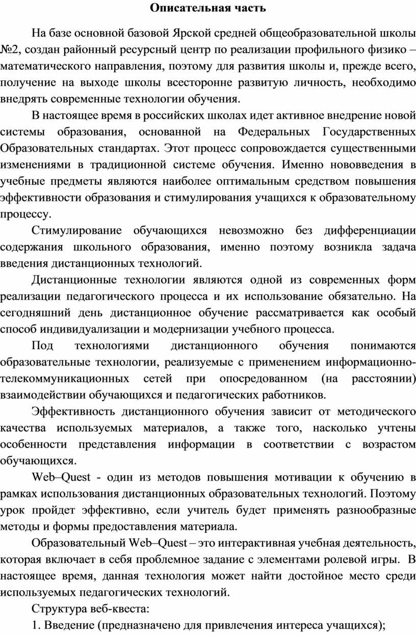 На базе основной базовой Ярской средней общеобразовательной школы №2, создан районный ресурсный центр по реализации профильного физико – математического направления, поэтому для развития школы и, прежде всего, получение на выходе школы всесторонне развитую личность, необходимо внедрять современные технологии обучения.