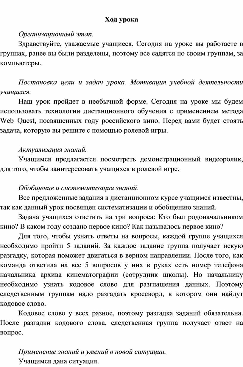 Наш урок пройдет в необычной форме. Сегодня на уроке мы будем использовать технологии дистанционного обучения с применением метода Web–Quest, посвященных году российского кино. Перед вами будет стоять задача, которую вы решите с помощью ролевой игры.