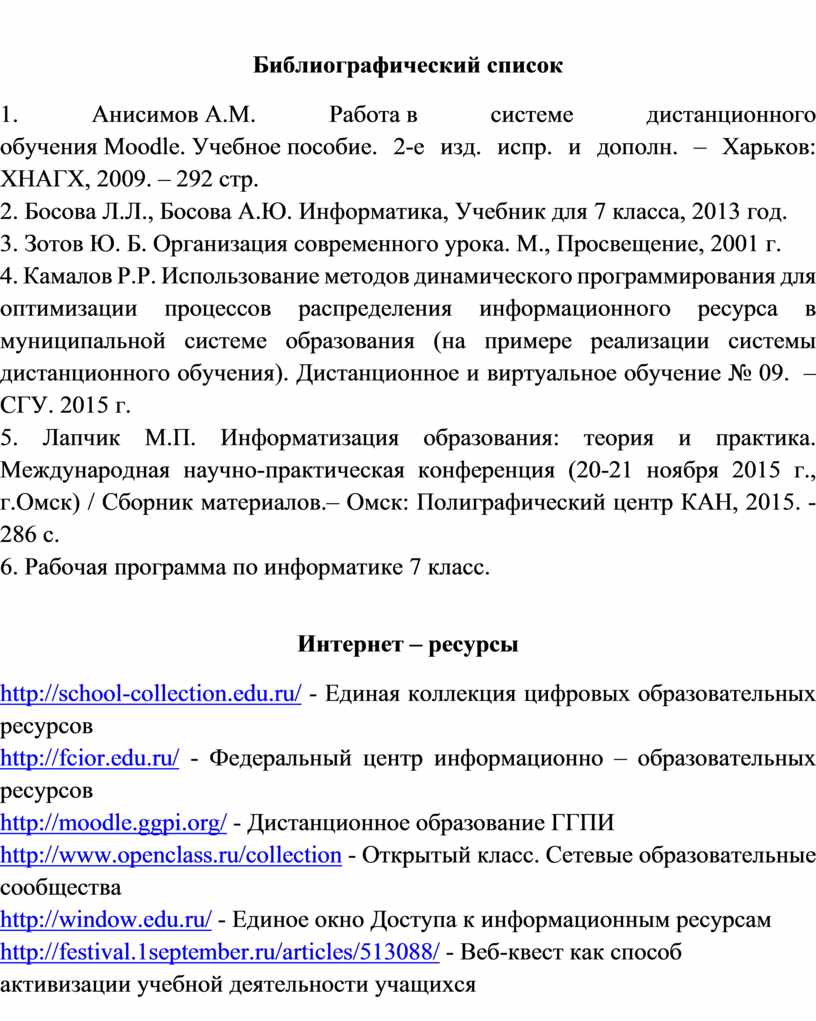 4. Камалов Р.Р. Использование методов динамического программирования для оптимизации процессов распределения информационного ресурса в муниципальной системе образования (на примере реализации системы дистанционного обучения). Дистанционное и виртуальное обучение № 09. – СГУ. 2015 г.