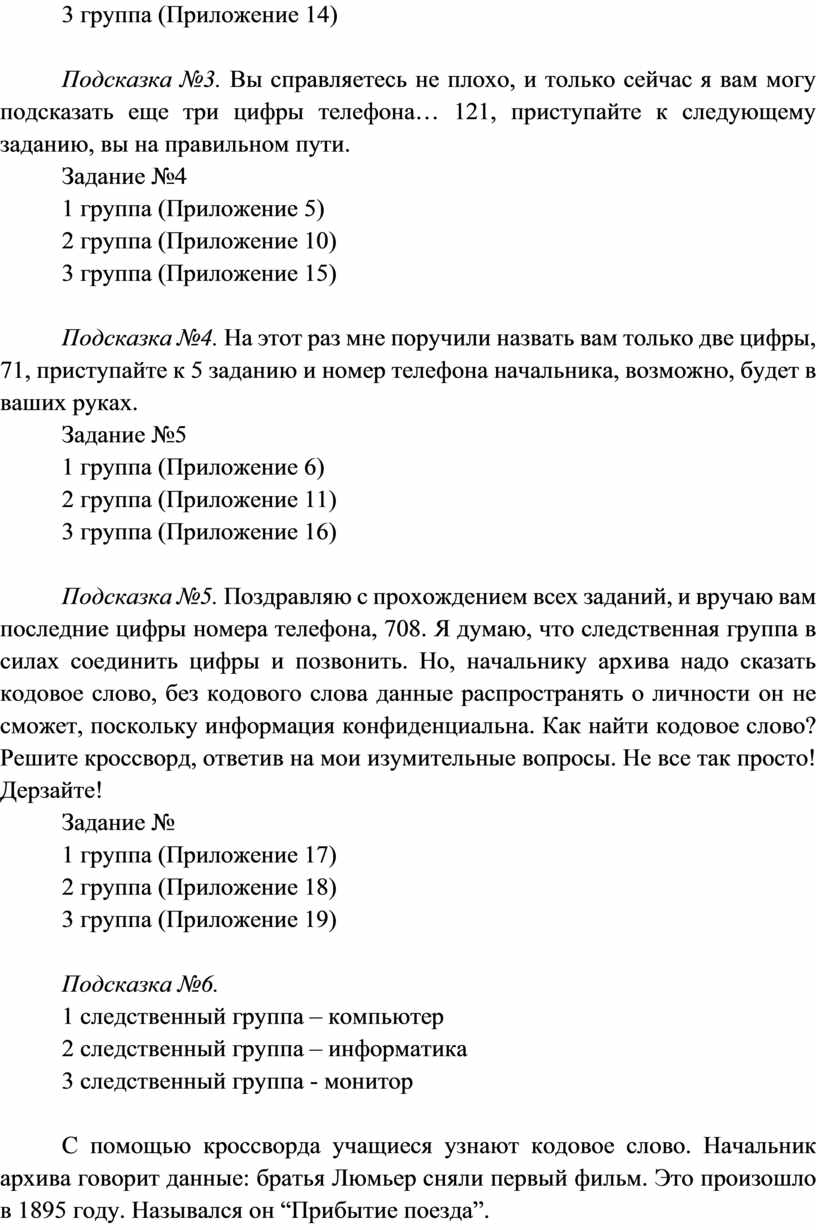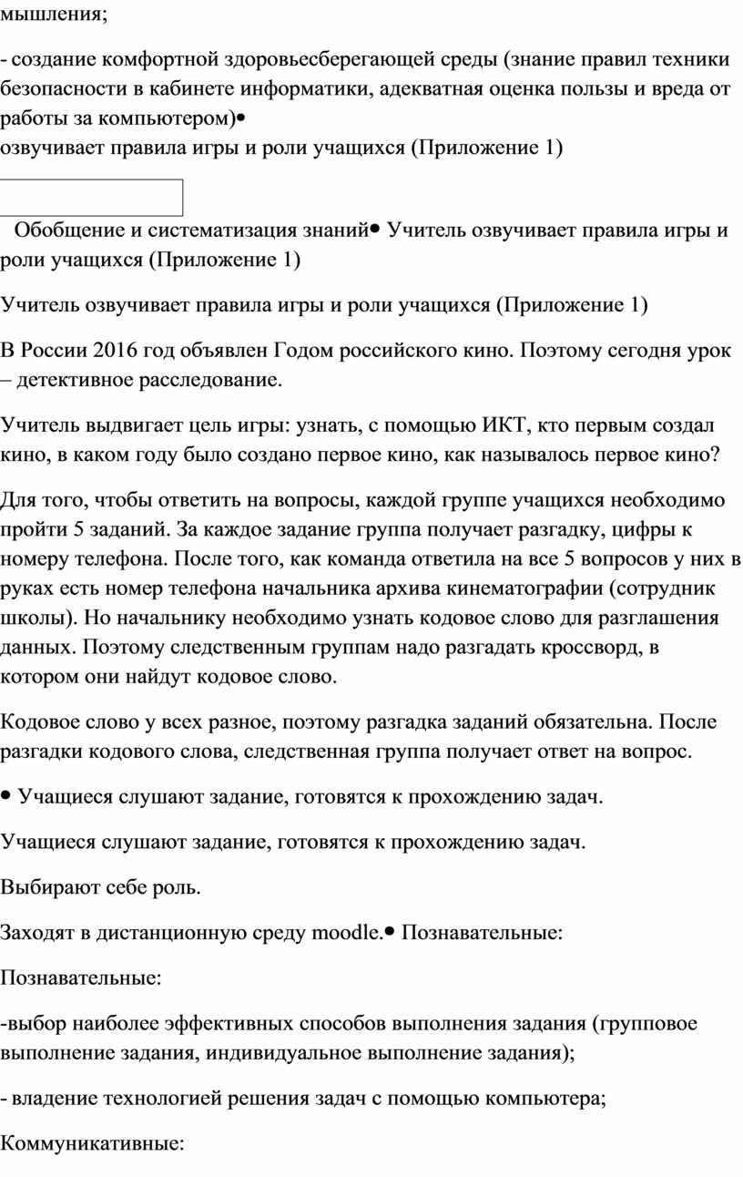 Учитель озвучивает правила игры и роли учащихся (Приложение 1) В России 2016 год объявлен Годом российского кино. Поэтому сегодня урок – детективное расследование. Учитель выдвигает цель игры: узнать, с помощью ИКТ, кто первым создал кино, в каком году было создано первое кино, как называлось первое кино? Для того, чтобы ответить на вопросы, каждой группе учащихся необходимо пройти 5 заданий. За каждое задание группа получает разгадку, цифры к номеру телефона. После того, как команда ответила на все 5 вопросов у них в руках есть номер телефона начальника архива кинематографии (сотрудник школы). Но начальнику необходимо узнать кодовое слово для разглашения данных. Поэтому следственным группам надо разгадать кроссворд, в котором они найдут кодовое слово. Кодовое слово у всех разное, поэтому разгадка заданий обязательна. После разгадки кодового слова, следственная группа получает ответ на вопрос.