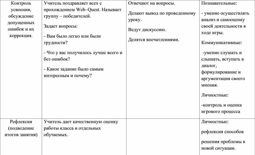 Учитель поздравляет всех с прохождением Web–Quest. Называет группу – победителей. Задает вопросы: - Вам было легко или были трудности? - Что у вас получилось лучше всего и без ошибок? - Какое задание было самым интересным и почему?