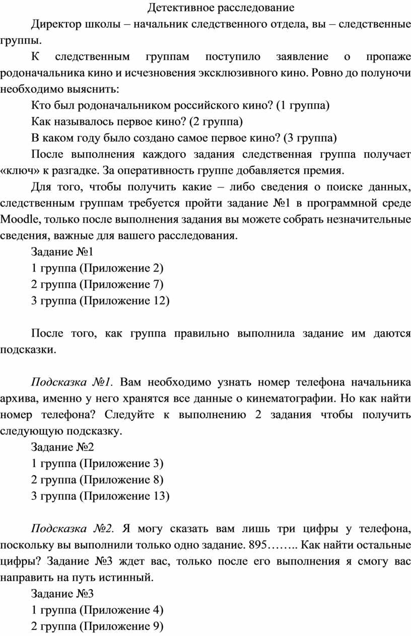 Для того, чтобы узнать ответы на вопросы, каждой группе учащихся необходимо пройти 5 заданий. За каждое задание группа получает некую разгадку, которая поможет двигаться в верном направлении. После того, как команда ответила на все 5 вопросов у них в руках есть номер телефона начальника архива кинематографии (сотрудник школы). Но начальнику необходимо узнать кодовое слово для разглашения данных. Поэтому следственным группам надо разгадать кроссворд, в котором они найдут кодовое слово.