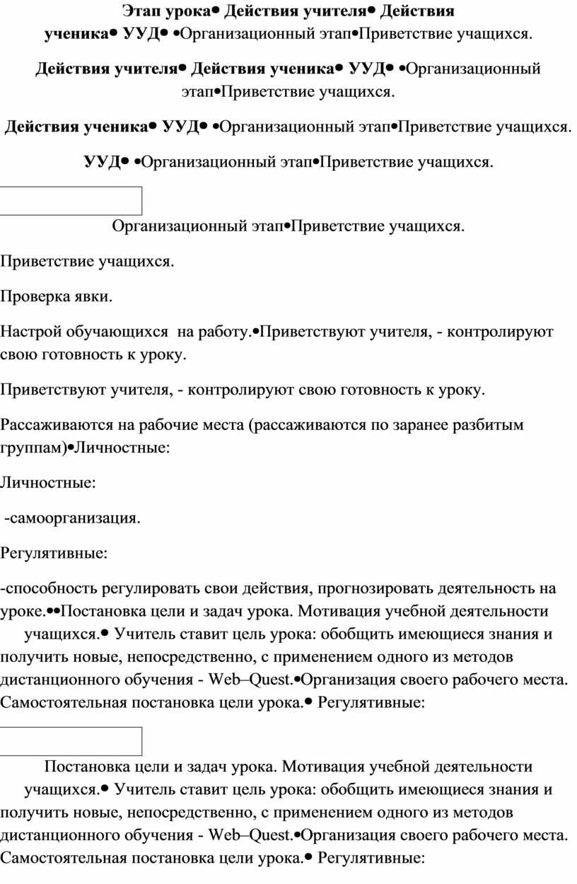 Учитель ставит цель урока: обобщить имеющиеся знания и получить новые, непосредственно, с применением одного из методов дистанционного обучения - Web–Quest. |