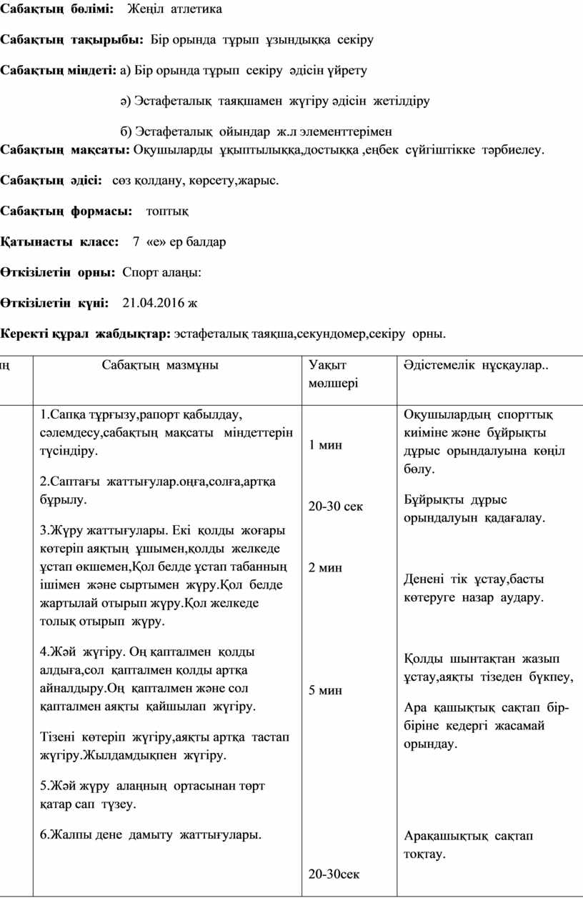 1.Сапқа тұрғызу,рапорт қабылдау, сәлемдесу,сабақтың мақсаты міндеттерін түсіндіру. 2.Саптағы жаттығулар.оңға,солға,артқа бұрылу. 3.Жүру жаттығулары. Екі қолды жоғары көтеріп аяқтың ұшымен,қолды желкеде ұстап өкшемен,Қол белде ұстап табанның ішімен және сыртымен жүру.Қол белде жартылай отырып жүру.Қол желкеде толық отырып жүру. 4.Жәй жүгіру. Оң қапталмен қолды алдыға,сол қапталмен қолды артқа айналдыру.Оң қапталмен және сол қапталмен аяқты қайшылап жүгіру. Тізені көтеріп жүгіру,аяқты артқа тастап жүгіру.Жылдамдықпен жүгіру. 5.Жәй жүру алаңның ортасынан төрт қатар сап түзеу. 6.Жалпы дене дамыту жаттығулары. -б.қ.а.а.и.к. қол белде басты оңға 4 рет солға 4 рет айналдыру. -б.қ.а.а.и.к. қолдың басы иықта 4 рет алға,4 рет артқа айналдыру. -б.қ.а.а.и.к. оң қолды 4 рет, сол қолды 4 рет көтеріп қайшылау. -б.қ.а.а.и.к. қол кеуде алдында 1-2 жазбай сермеу,3-4 жазып сермеу. -б.қ.а.а.и.к. оң қол жоғарыда сол қол белде 1-2 оңға иілу,3-4 солға иілу -Аяқтың арасын алшақ ұстап бір оң аяққа отыру ,екі ортаға ,үш сол аяққа отыру. -Қолдың басы тізеде 4 рет ішке,4 рет сыртқа айналдыру. -Оң аяқпен 10 рет, сол аяқпен 10 рет,қос аяқпен 10 рет секіреміз. Дем алу дем шығару 4 қатардан бір қатар сап түзеу