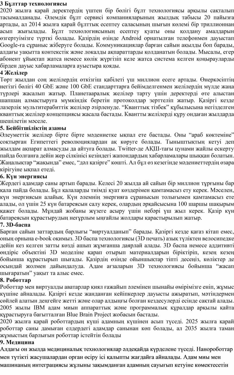 Техникалық прогресс деңгейі компьютерлерлердің есептеу қуаты тәрізді геометриялық прогрессия бойынша өсіп жатыр. Демек, алдағы уақытта өткеннен қарағанда технологиялық жетістіктер қатары әлдеқайда көбейе түспек. Технология саласында серпінді жобалардың қандай болатынын алдын-ала дөп басып айту қиын. Алайда әлемдегі зерттеу орталықтарының болжамдарына қарап бізді не күтіп тұрғанын шамалап болса да айтуға болады.