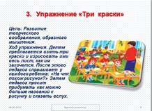 Ход упражнения. Детям предлагается взять три краски и изрисовать ими весь лист, как им захочется. После этого педагог спрашивает у каждого ребенка: «На что похож рисунок?» Затем педагог просит придумать как можно больше названий к рисунку и сказать вслух.
