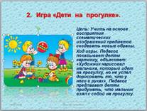 Ход игры. Педагог показывает детям картинку, объясняет: «Художник нарисовал мальчика, который идет на прогулку, но не успел дорисовать то, что у него в руках». Педагог предлагает детям придумать, что мальчик взял с собой на прогулку.