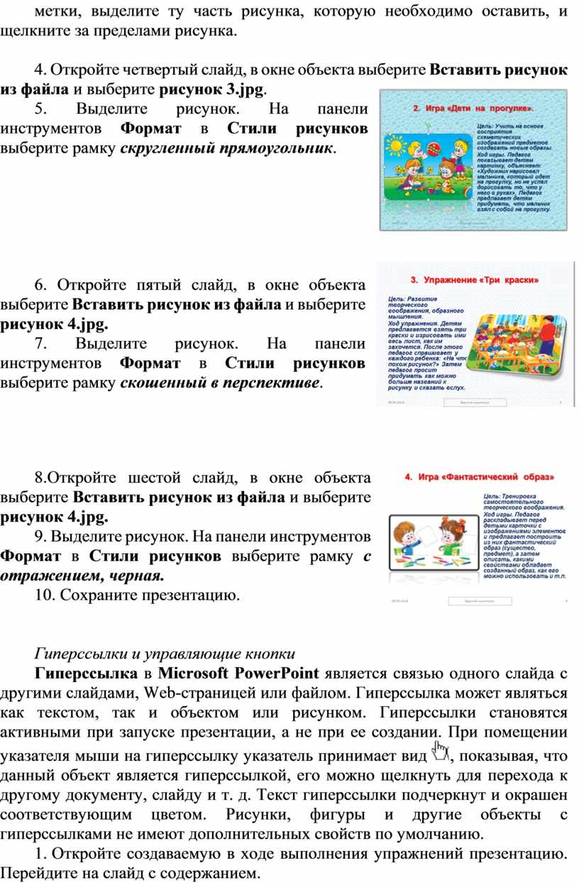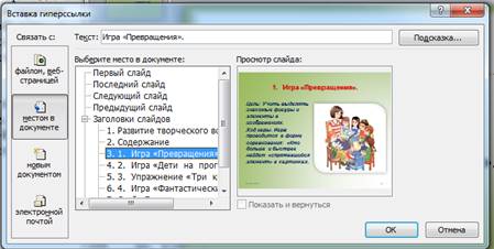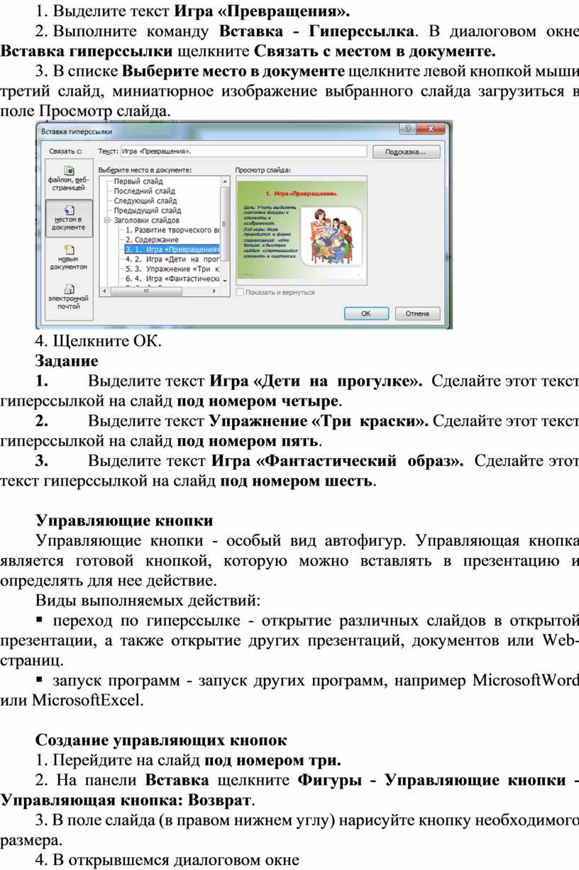 1. Выделите текст Игра «Дети на прогулке». Сделайте этот текст гиперссылкой на слайд под номером четыре.