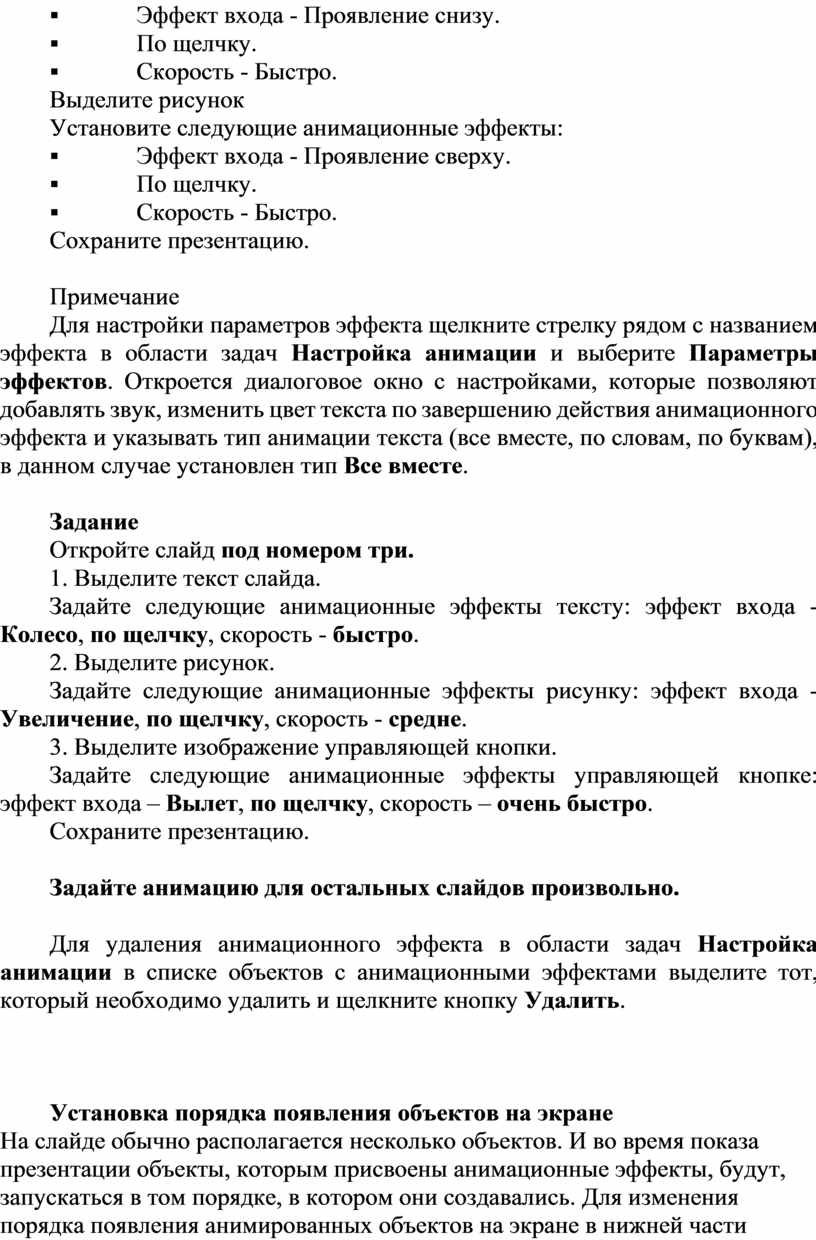 Задайте следующие анимационные эффекты рисунку: эффект входа - Увеличение, по щелчку, скорость - средне.