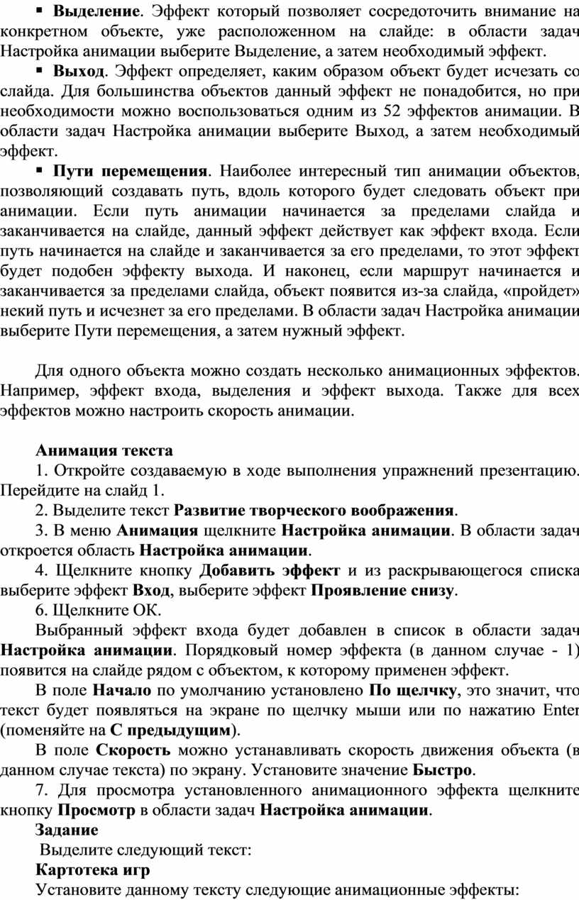 § Вход. Данный эффект определяет способ появления объекта на слайде. Если эффект не задан, объект появляется в той области, в которой он расположен на слайде. Если же во время показа слайдов требуется ввести текст или объект в сопровождении определенного визуального эффекта, в области задач Настройка анимации выберите Вход, а затем необходимый эффект.