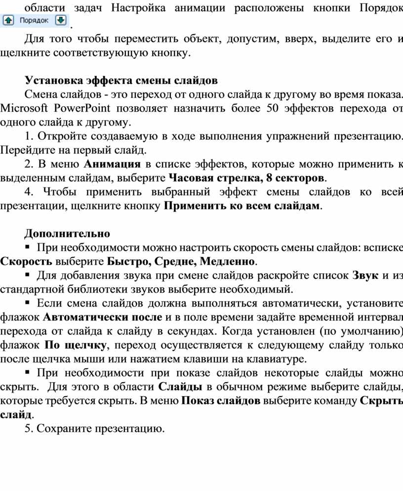 Анимация - это добавление к тексту или объекту специального видео- или звукового эффекта. Например, можно создать элементы текстового списка, вылетающие на страницу слева по одному слову или добавить звук аплодисментов при открытии рисунка.