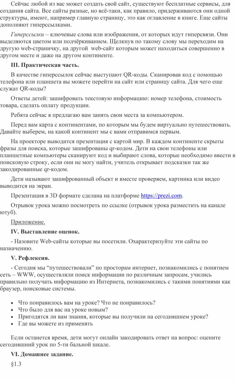 На проекторе выводится презентация с картой мир. В каждом континенте скрыты фразы для поиска, которые зашифрованы qr-кодом. Дети на свои телефоны или планшетные компьютеры сканируют код и выбирают слова, которые необходимо ввести в поисковую строку, если они не могу найти, учитель открывает подсказки так же закодированные qr-кодом.