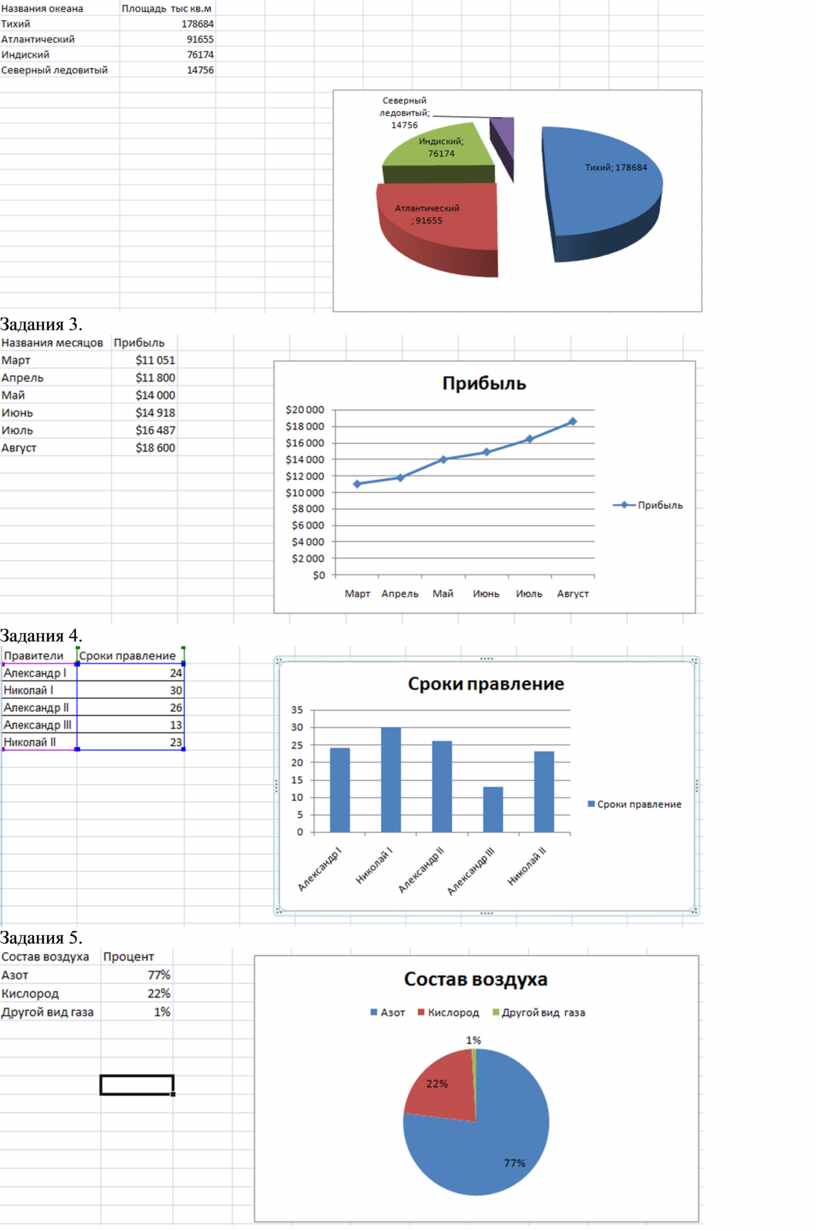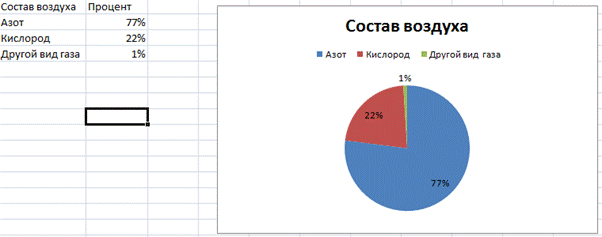 Задание 5. Состав воздуха следующий: содержание Азота – 77 %, Кислорода – 22 %, Других газов – 1 %. Построить диаграмму из которой будет видно содержание газов в воздухе.