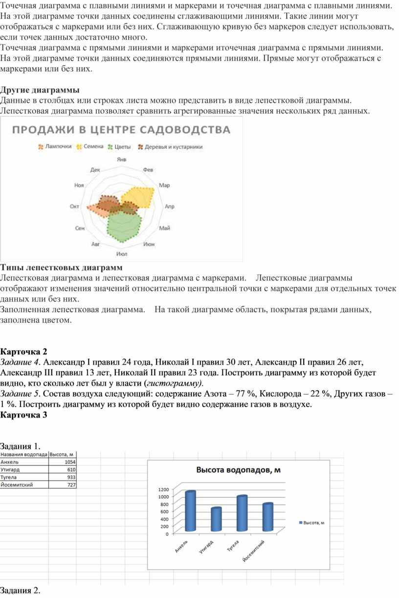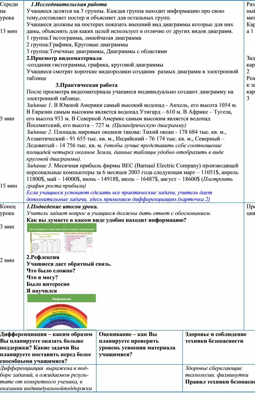 1.Исследовательская работа Учащиеся делятся на 3 группы. Каждая группа находит информацию про свою тему,составляет постер и объясняет для остальных групп. Учащиеся должны на постерах показать внешний вид диаграммы которые для них даны, объяснить для каких целей использует в отличие от других видов диаграмм. 1 группа:Гистограмма, линейчатая диаграмма 2 группа:Графики, Круговые диаграммы 3 группа:Точечные диаграммы, Диаграммы с областями 2.Просмотр видеоматериала -создания гистограммы, графика, круговой диаграммы Учащиеся смотрят короткие видеоролики создания разных диаграмм в электронной таблице 3.Практическая работа После просмотра видеоматериала учащиеся индивидуально создают диаграмму на электронной таблице. Задание 1. В Южной Америки самый высокий водопад - Анхель, его высота 1054 м. В Евразии самым высоким является водопад Утигард – 610 м. В Африке – Тугела, его высота 933 м. В Северной Америке самым высоким является водопад Йосемитский, его высота – 727 м. (Цилиндрическую диаграмму) Задание 2. Площадь мировых океанов такова: Тихий океан - 178 684 тыс. кв. м., Атлантический - 91 655 тыс. кв. м., Индийский - 76 174 тыс. кв. м., Северный – Ледовитый - 14 756 тыс. кв. м. (чтобы лучше представить себе соотношение площадей четырех океанов Земли, данные таблицы удобно отобразить в виде круговой диаграммы). Задание 3. Месячная прибыль фирмы BEC (Barnaul Electric Company) производящей персональные компьютеры за 6 месяцев 2003 года следующая март – 11051$, апрель 11800$, май – 14000$, июнь - 14918$, июль – 16487$, август – 18600$ (Построить график роста прибыли) Если учащиеся успевают сделать все практические задачи, учитель дает дополнительные задачи, здесь применяем дифференциацию.(карточка 2) |