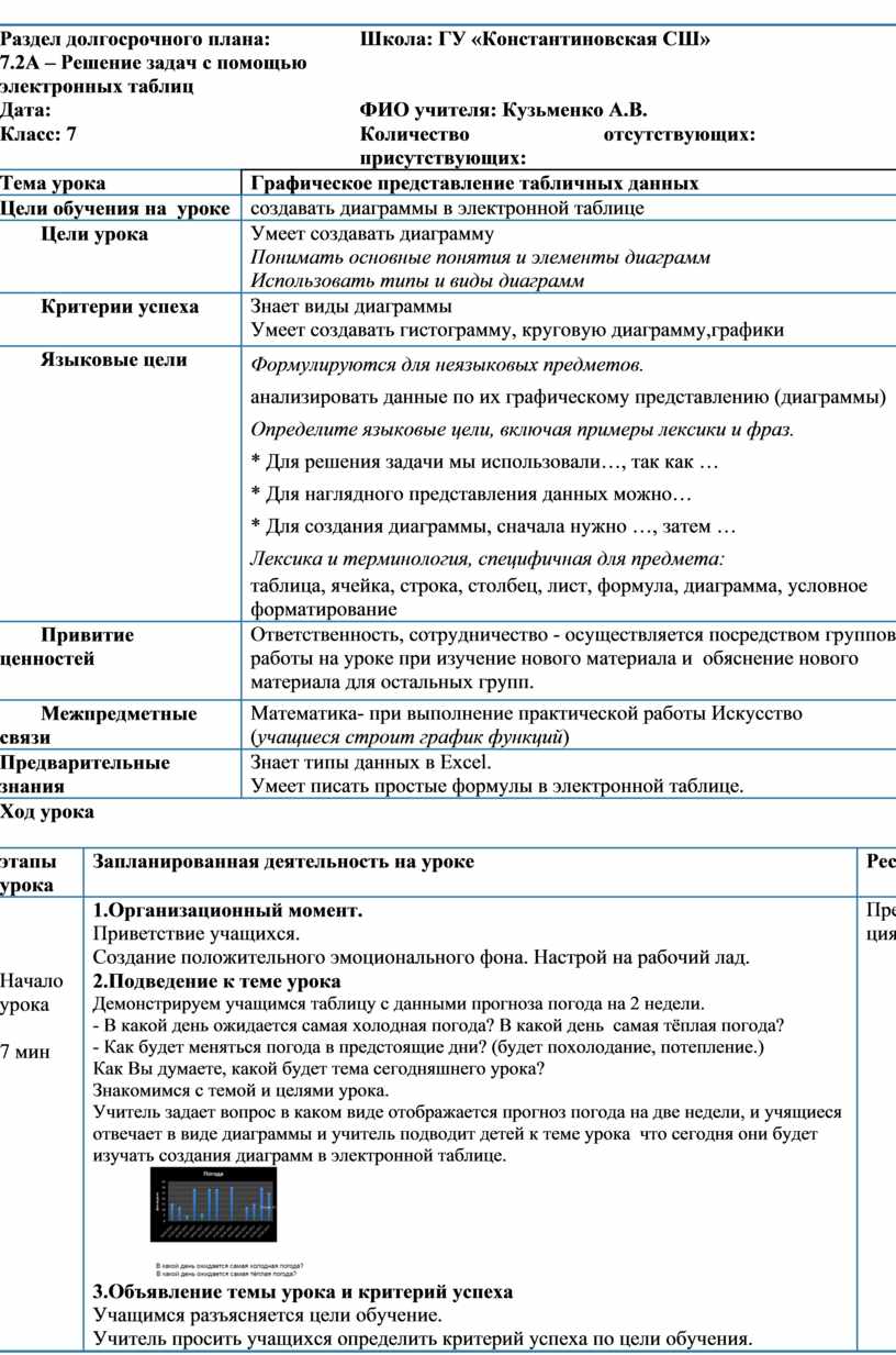 Раздел долгосрочного плана: 7.2А – Решение задач с помощью электронных таблиц |