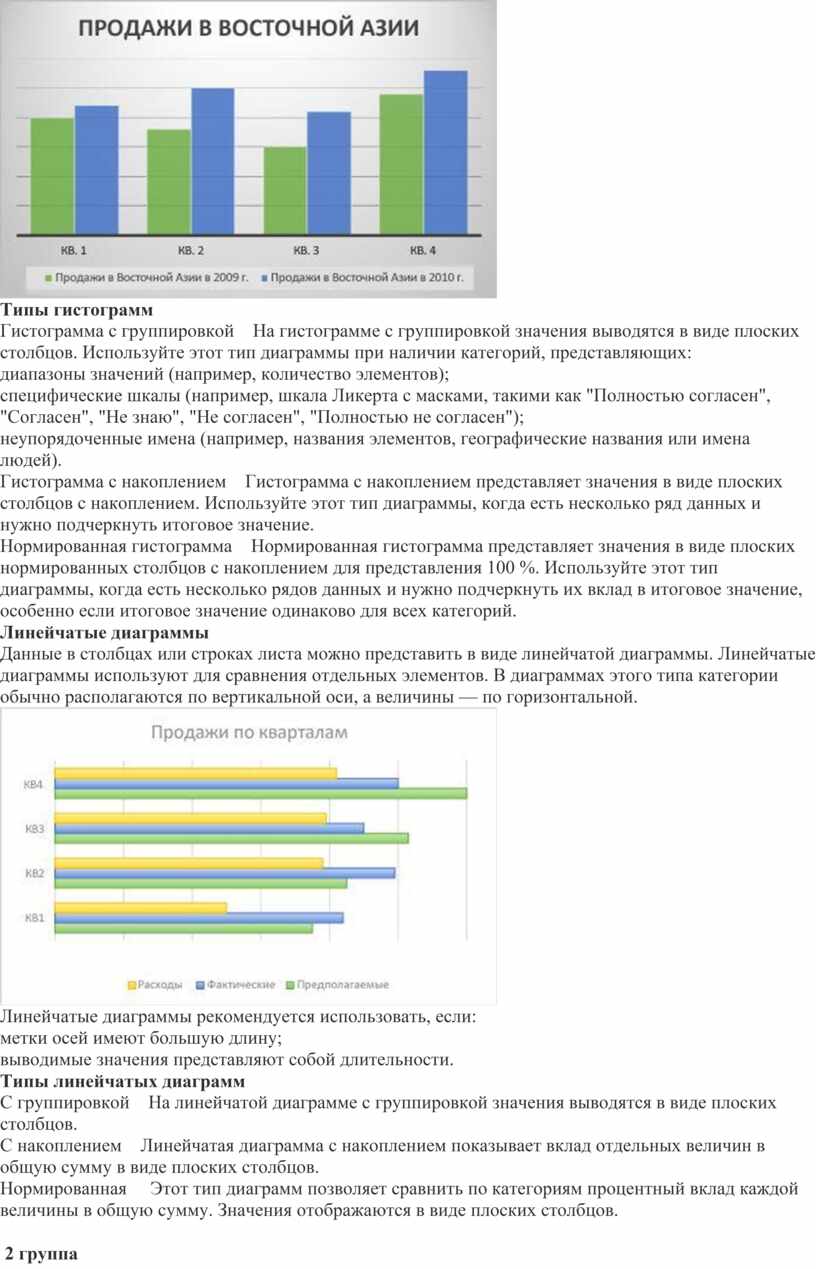 Гистограмма с накоплением Гистограмма с накоплением представляет значения в виде плоских столбцов с накоплением. Используйте этот тип диаграммы, когда есть несколько ряд данных и нужно подчеркнуть итоговое значение.