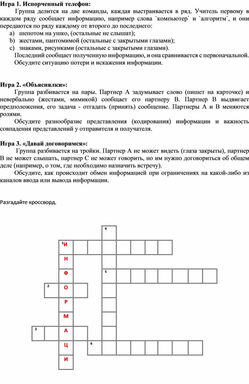 Группа делится на две команды, каждая выстраивается в ряд. Учитель первому в каждом ряду сообщает информацию, например слова `компьютер` и `алгоритм`, и они передаются по ряду каждому от второго до последнего: