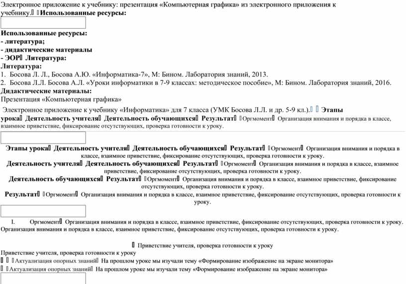 Литература: 1. Босова Л. Л., Босова А.Ю. «Информатика-7», М: Бином. Лаборатория знаний, 2013. 2. Босова Л.Л. Босова А.Л. «Уроки информатики в 7-9 классах: методическое пособие», М: Бином. Лаборатория знаний, 2016. Дидактические материалы: Презентация «Компьютерная графика»Электронное приложение к учебнику «Информатика» для 7 класса (УМК Босова Л.Л. и др. 5-9 кл.). |