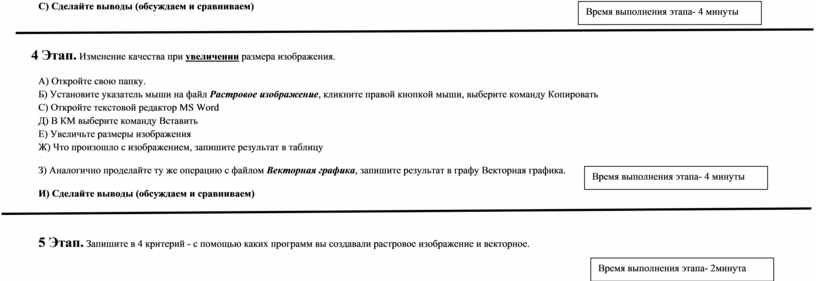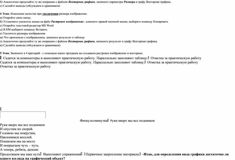 4 Этап. Изменение качества при увеличении размера изображения. а) Откройте свою папку. б) Установите указатель мыши на файл Растровое изображение , кликните правой кнопкой мыши, выберите команду Копировать с) Откройте текстовой редактор MS Word д) В КМ выберите команду Вставить е) Увеличьте размеры изображения ж) Что произошло с изображением, запишите результат в таблицу з) Аналогично проделайте ту же операцию с файлом Векторная графика, запишите результат в графу Векторная графика. и) Сделайте выводы (обсуждаем и сравниваем)