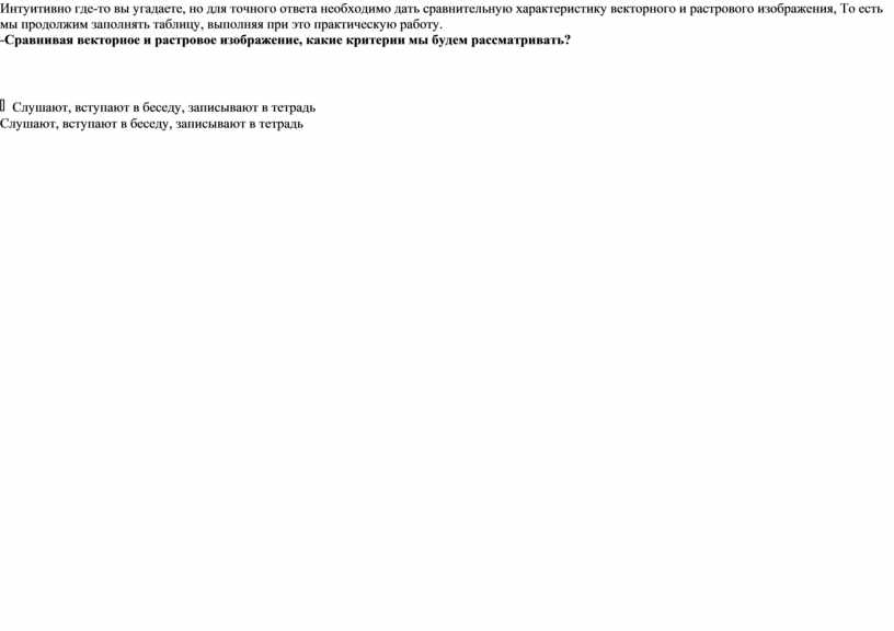 Векторный подход рассматривает изображение как совокупность простых элементов: прямых линии, дуг, окружностей, эллипсов, прямоугольников и пр., которые называются графическими примитивами. Посмотрите на следующее изображение, если его разобрать на отдельные фрагменты, мы увидим, что изображение состоит из простейших геометрических фигур. Каждая из этих фигур может быть описана математически –отрезки и прямоугольники –координатами своих вершин, окружности –координатами центров и радиусами. При сохранении векторного изображения в память компьютера заносится информация о простейших геометрических объектах, его составляющих, то есть о графических примитивах и описывающих их математических формул. Слайд Перед вами таблица, в этой таблице мы можем сейчас заполнить первый пункт Формирование изображения. (Приложение 1) Слайд -Посмотрите на эти графические изображения, можете вы сейчас назвать какие графические объекты относятся к векторным, а какие к растровым? Почему? Выскажите предположения? Интуитивно где-то вы угадаете, но для точного ответа необходимо дать сравнительную характеристику векторного и растрового изображения, То есть мы продолжим заполнять таблицу, выполняя при это практическую работу. -Сравнивая векторное и растровое изображение, какие критерии мы будем рассматривать?
