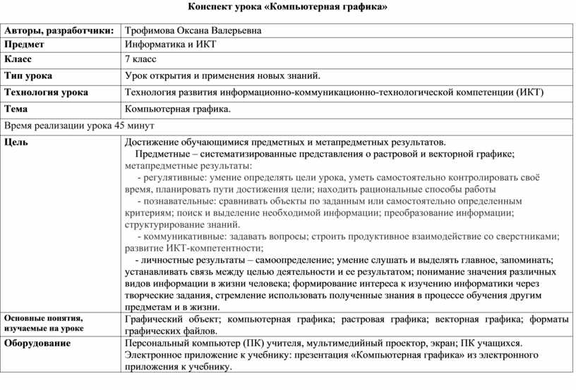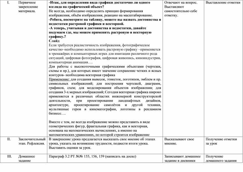 Достижение обучающимися предметных и метапредметных результатов. Предметные – систематизированные представления о растровой и векторной графике; метапредметные результаты: - регулятивные: умение определять цели урока, уметь самостоятельно контролировать своё время, планировать пути достижения цели; находить рациональные способы работы - познавательные: сравнивать объекты по заданным или самостоятельно определенным критериям; поиск и выделение необходимой информации; преобразование информации; структурирование знаний. - коммуникативные: задавать вопросы; строить продуктивное взаимодействие со сверстниками; развитие ИКТ-компетентности; - личностные результаты – самоопределение; умение слушать и выделять главное, запоминать; устанавливать связь между целью деятельности и ее результатом; понимание значения различных видов информации в жизни человека; формирование интереса к изучению информатики через творческие задания, стремление использовать полученные знания в процессе обучения другим предметам и в жизни. |