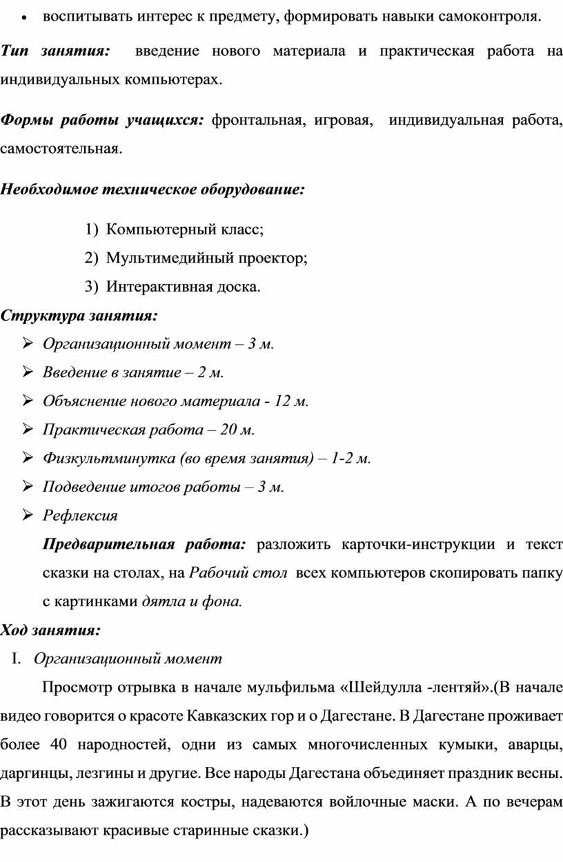 Предварительная работа: разложить карточки-инструкции и текст сказки на столах, на Рабочий стол всех компьютеров скопировать папку с картинками дятла и фона.