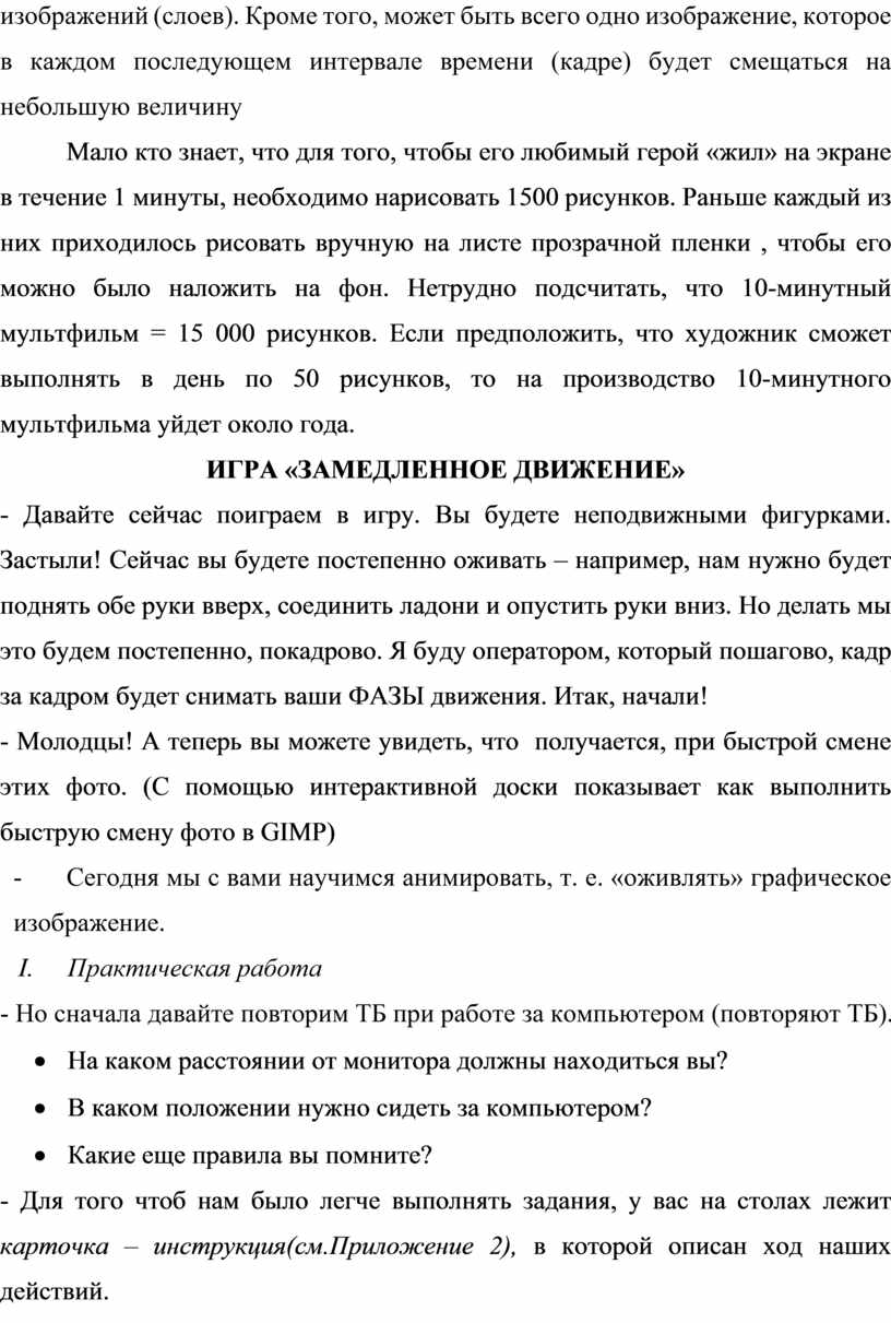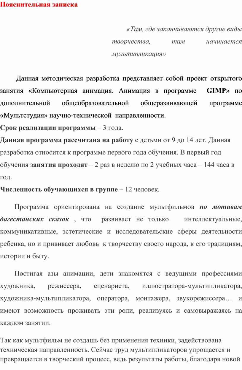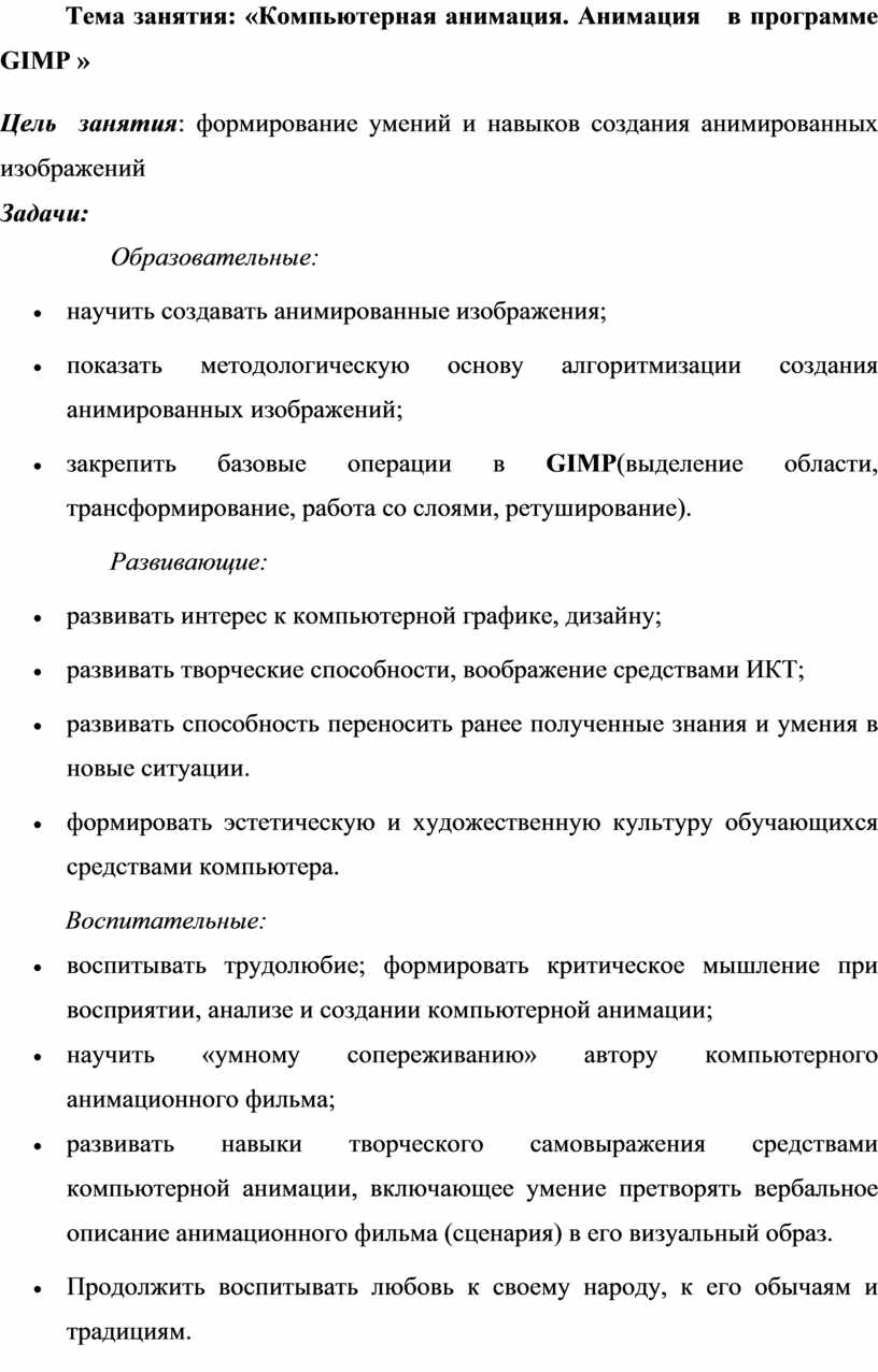 Данная методическая разработка представляет собой проект открытого занятия «Компьютерная анимация. Анимация в программе GIMP» по дополнительной общеобразовательной общеразвивающей программе «Мультстудия» научно-технической направленности.