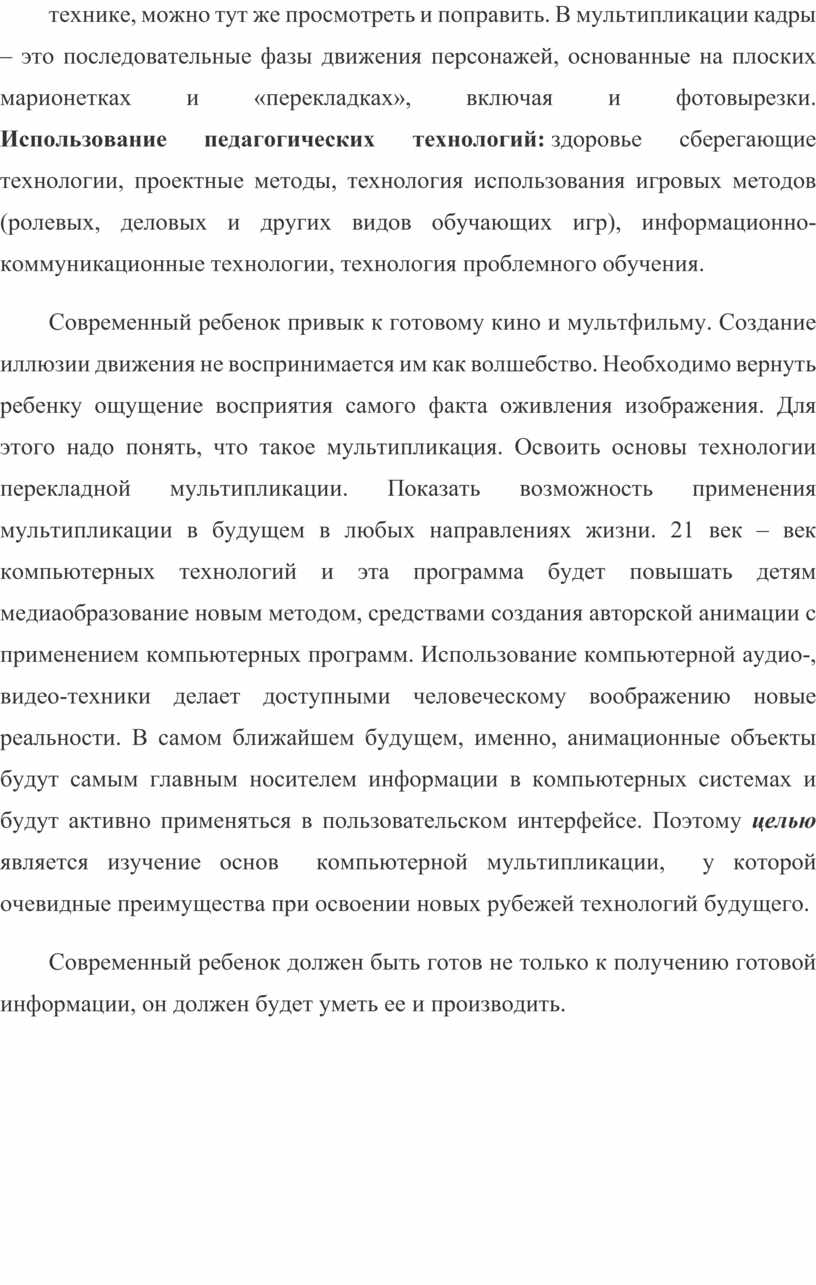 Современный ребенок привык к готовому кино и мультфильму. Создание иллюзии движения не воспринимается им как волшебство. Необходимо вернуть ребенку ощущение восприятия самого факта оживления изображения. Для этого надо понять, что такое мультипликация. Освоить основы технологии перекладной мультипликации. Показать возможность применения мультипликации в будущем в любых направлениях жизни. 21 век – век компьютерных технологий и эта программа будет повышать детям медиаобразование новым методом, средствами создания авторской анимации с применением компьютерных программ. Использование компьютерной аудио-, видео-техники делает доступными человеческому воображению новые реальности. В самом ближайшем будущем, именно, анимационные объекты будут самым главным носителем информации в компьютерных системах и будут активно применяться в пользовательском интерфейсе. Поэтому целью является изучение основ компьютерной мультипликации, у которой очевидные преимущества при освоении новых рубежей технологий будущего.
