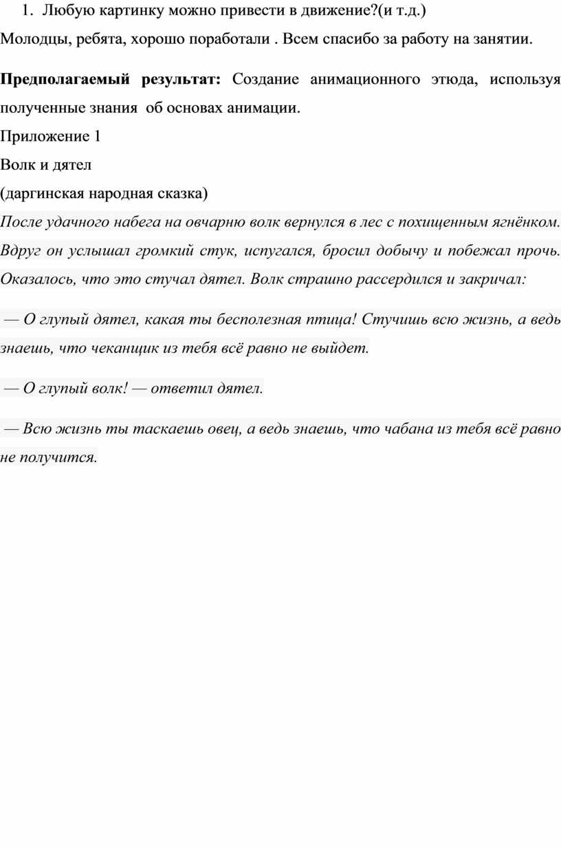 - Ребята, а чтобы создать мультфильм нам необходимо определится со сценарием. Я вам предлагаю выбрать дагестанскую народную сказку «Волк и дятел». Давайте сначала ее почитаем. (см. Приложение1)