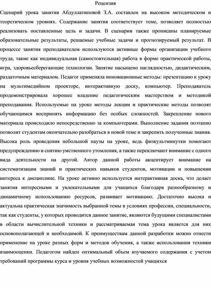 Сценарий урока занятия Абдуллатиповой З.А. составлен на высоком методическом и теоретическом уровнях. Содержание занятия соответствует теме, позволяет полностью реализовать поставленные цель и задачи. В сценарии также прописаны планируемые образовательные результаты, решаемые учебные задачи и прогнозируемый результат. В процессе занятия преподавателем используются активные формы организации учебного труда, такие как индивидуальная (самостоятельная) работа в форме практической работы, игра, здоровьесберегающие технологии. Занятие насыщено наглядностью, дидактическим, раздаточным материалом. Педагог применяла инновационные методы: презентацию к уроку на мультимедийном проекторе, интерактивную доску, компьютер. Преподаватель продемонстрировала хорошее владение педагогическим мастерством и методикой преподавания. Используемые на уроке методы лекции и практические методы позволят обучающимся воспринять информацию без особых сложностей. Закрепление нового материала происходило непосредственно за компьютерами. Выполнение задания поэтапно позволит студентам окончательно разобраться в новой теме и закрепить полученные знания. Высока роль проведения небольшой паузы на уроке, ведь физкультминутки помогают предупреждению и снятию умственного утомления, а также переключают внимание с одного вида деятельности на другой. Автор данной работы акцентирует внимание на систематизации знаний и практических навыков студентов, мотивации и повышении интереса к дисциплине. На уроке активно используется интерактивная доска, что делает занятия интересными и увлекательными для учащихся благодаря разнообразному и динамичному использованию ресурсов, развивает мотивацию. Достаточно высока и актуальна практическая значимость выбранной темы в условиях профессии, специальности, так как студенты, у которых проводится данное занятие, являются будущими специалистами в области вычислительной техники и рассматриваемая тема урока является для них основополагающей и необходимой. К преимуществам данной разработки можно отнести применение на уроке разных форм и методов обучения, а также использования техники взаимооценки. Педагогом найден оптимальный объем изучаемого содержания с учетом требований программы курса и уровня учебных возможностей учащихся