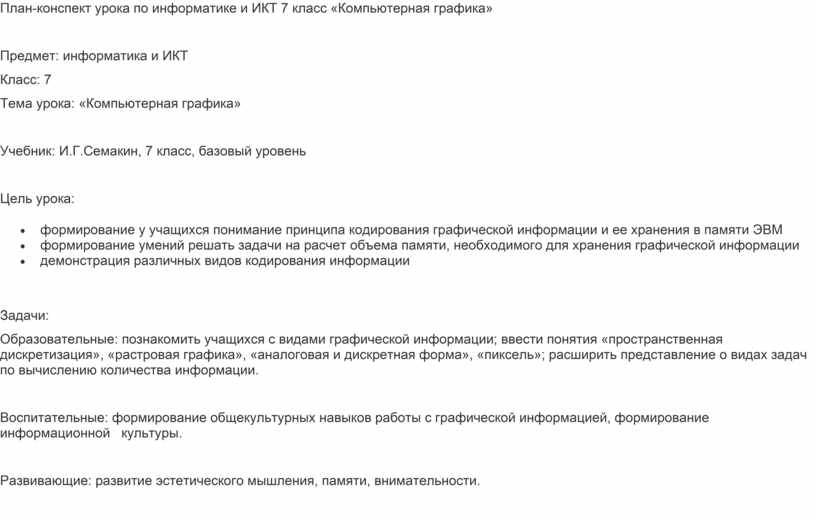 План-конспект урока по информатике и ИКТ 7 класс «Компьютерная графика»