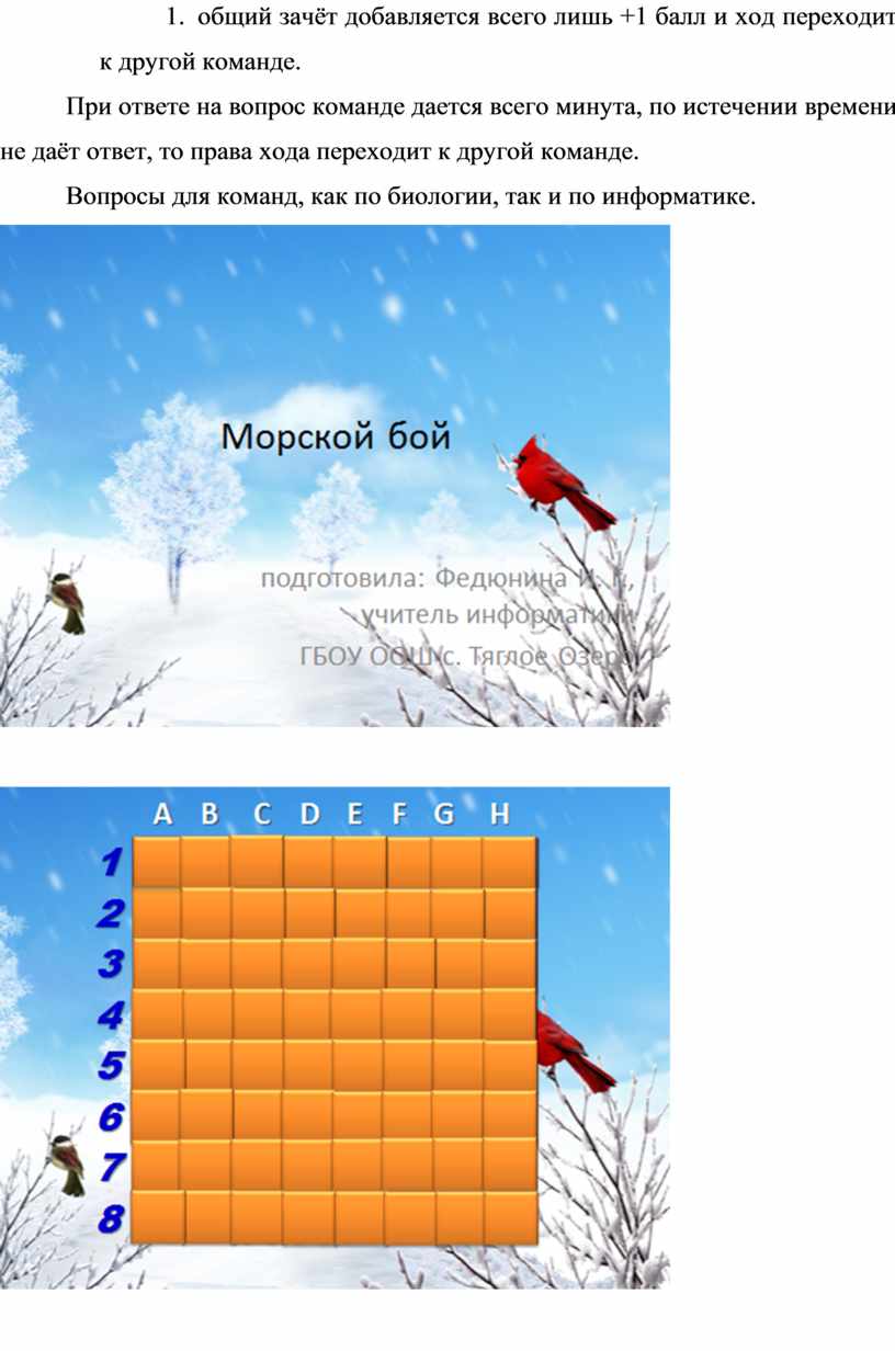 1. команда делает ход и не попадает в корабль - отвечает на вопрос. Ответ правильный – 1 балл и продолжает стрелять. В случае неправильного ответа - ход другой команде.