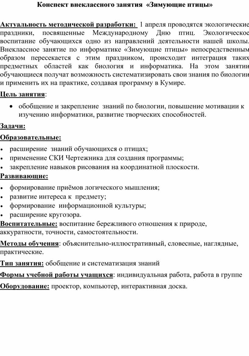 Актуальность методической разработки: 1 апреля проводятся экологические праздники, посвященные Международному Дню птиц. Экологическое воспитание обучающихся одно из направлений деятельности нашей школы. Внеклассное занятие по информатике «Зимующие птицы» непосредственным образом пересекается с этим праздником, происходит интеграция таких предметных областей как биология и информатика. На этом занятии обучающиеся получат возможность систематизировать свои знания по биологии и применить их на практике, создавая программу в Кумире.
