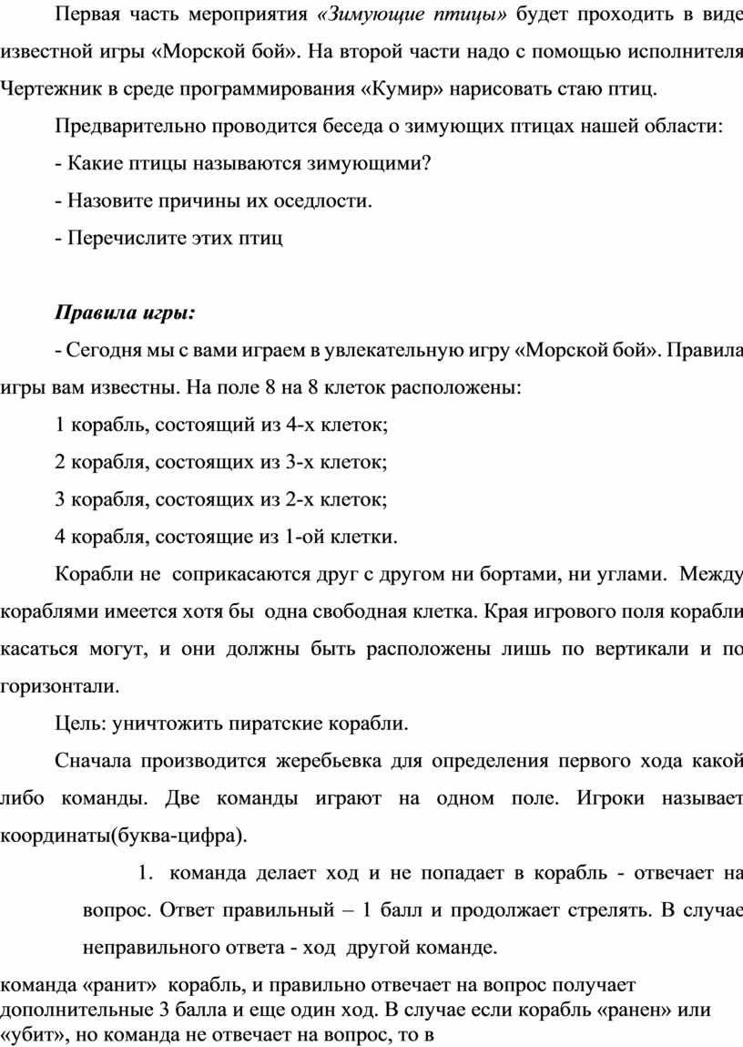 Первая часть мероприятия «Зимующие птицы» будет проходить в виде известной игры «Морской бой». На второй части надо с помощью исполнителя Чертежник в среде программирования «Кумир» нарисовать стаю птиц.