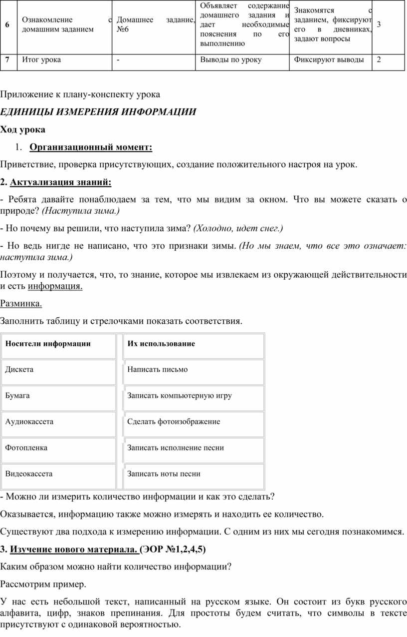 Приложение к плану-конспекту урока