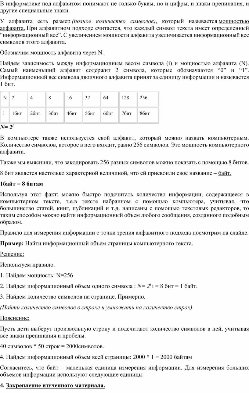 Выучить правило для измерения информации с точки зрения алфавитного подхода.