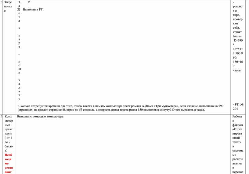 1. Работа в паре - реши задачу: Сколько потребуется времени для того, чтобы ввести в память компьютера текст романа А.Дюма «Три мушкетера», если издание выполнено на 590 страницах, на каждой странице 48 строк по 53 символа, а скорость ввода текста равна 150 символов в минуту? Ответ выразить в часах. 2. Выполни в РТ. |