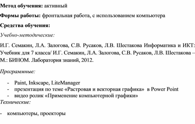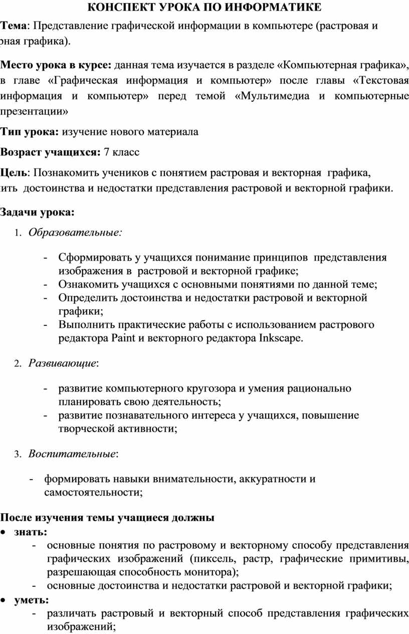 Место урока в курсе: данная тема изучается в разделе «Компьютерная графика», в главе «Графическая информация и компьютер» после главы «Текстовая информация и компьютер» перед темой «Мультимедиа и компьютерные презентации»