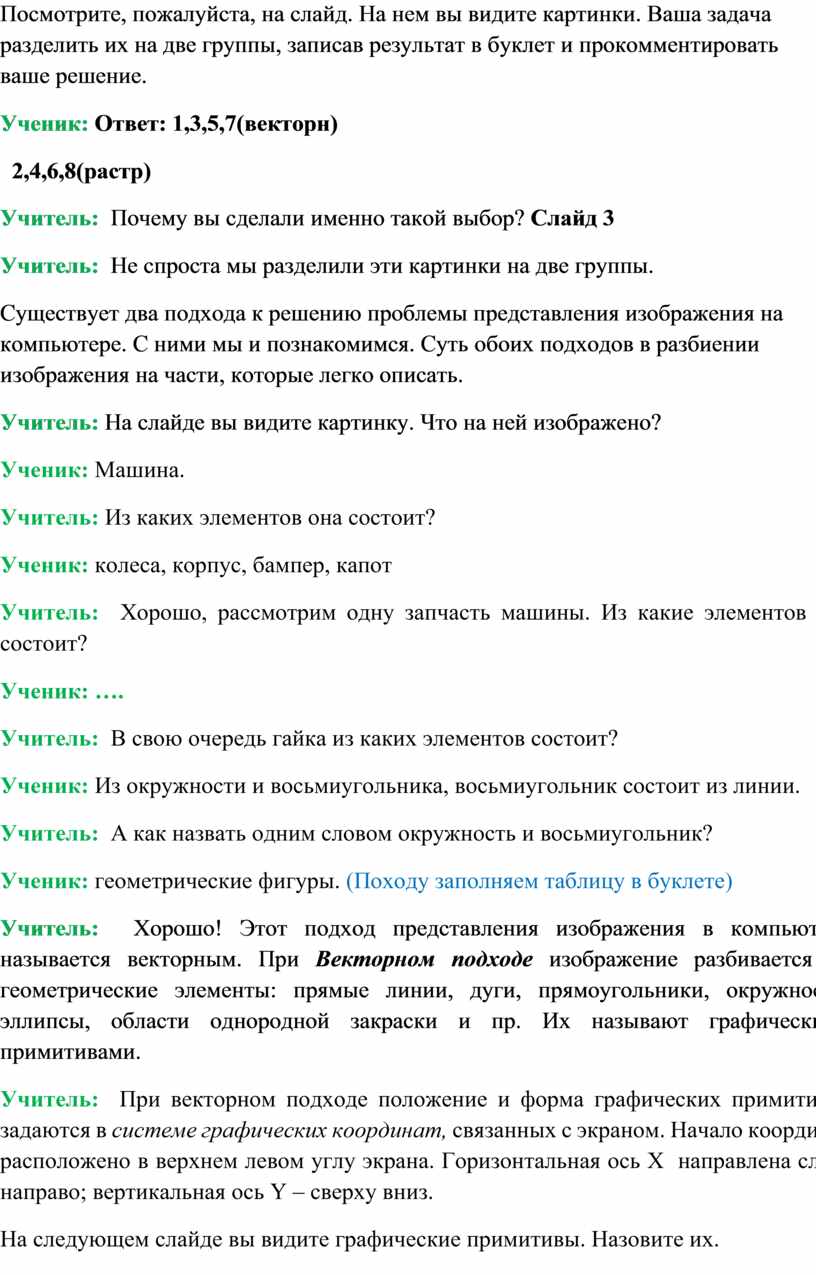 Учитель: Хорошо! Этот подход представления изображения в компьютере называется векторным. При Векторном подходе изображение разбивается на геометрические элементы: прямые линии, дуги, прямоугольники, окружности, эллипсы, области однородной закраски и пр. Их называют графическими примитивами.