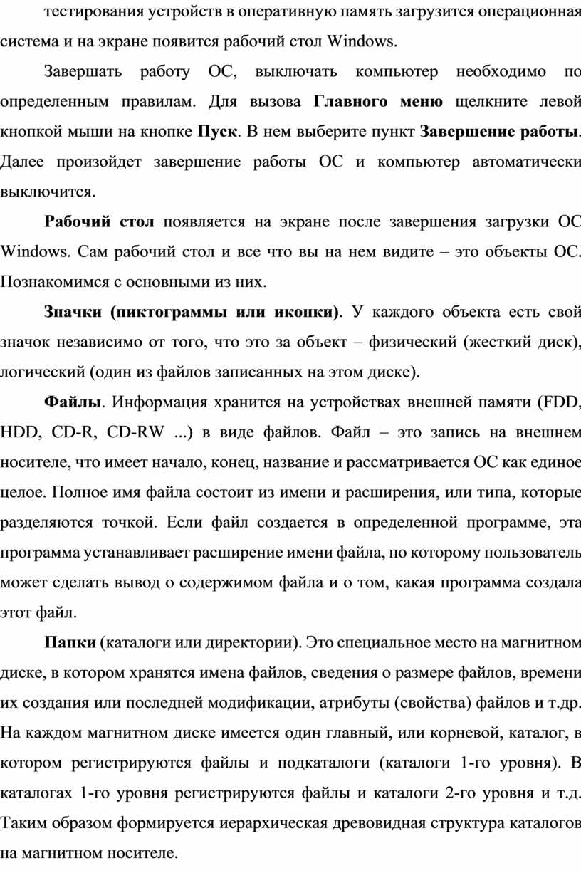Файлы. Информация хранится на устройствах внешней памяти (FDD, HDD, CD-R, CD-RW ...) в виде файлов. Файл – это запись на внешнем носителе, что имеет начало, конец, название и рассматривается ОС как единое целое. Полное имя файла состоит из имени и расширения, или типа, которые разделяются точкой. Если файл создается в определенной программе, эта программа устанавливает расширение имени файла, по которому пользователь может сделать вывод о содержимом файла и о том, какая программа создала этот файл.