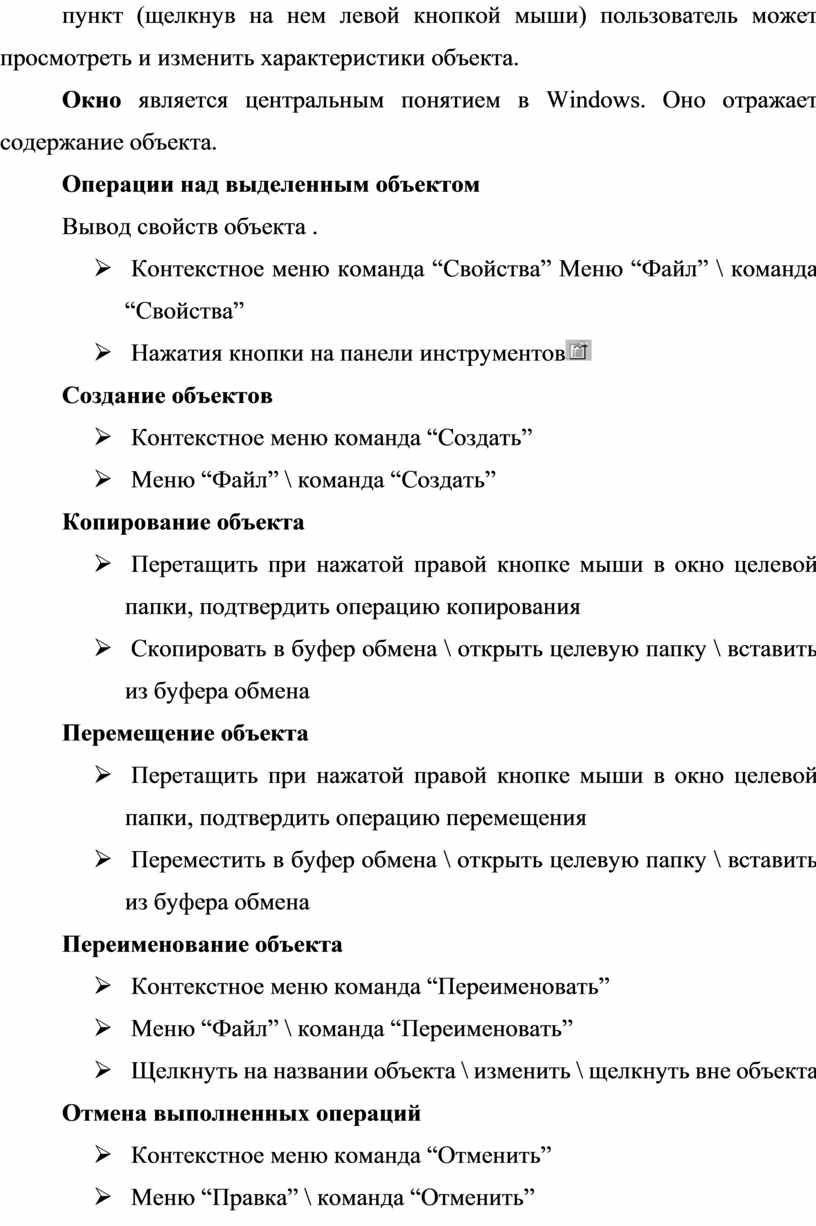Контекстное меню имеет каждый объект ОС Windows. Для его вызова достаточно щелкнуть правой кнопкой мыши на значке объекта. Для выполнения любой операции с объектом достаточно вывести его контекстное меню, которое содержит команды для работы именно с этим объектом. Контекстное меню каждого объекта содержит пункт “Свойства”. Выбрав этот пункт (щелкнув на нем левой кнопкой мыши) пользователь может просмотреть и изменить характеристики объекта.