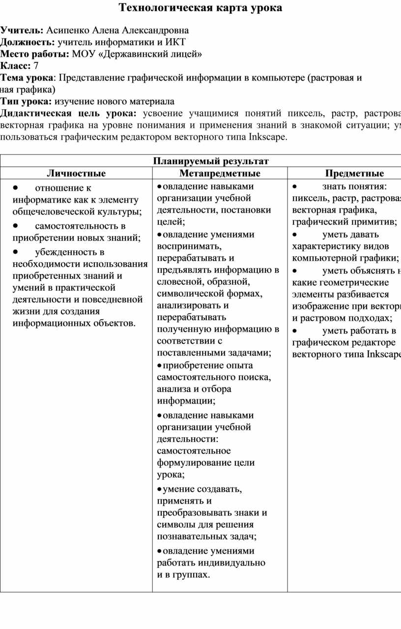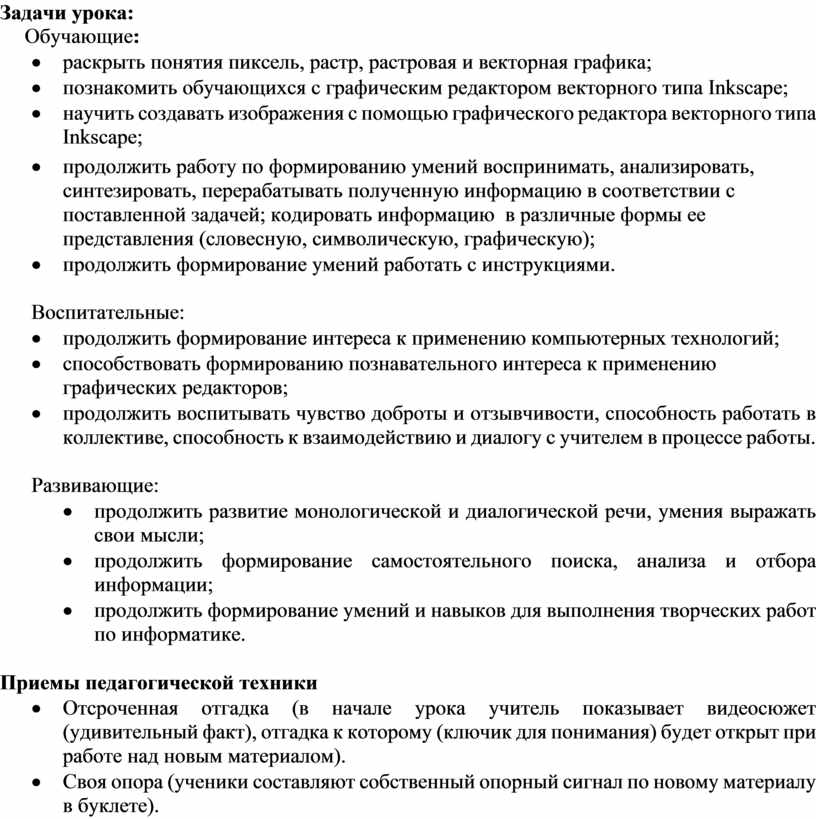 Дидактическая цель урока: усвоение учащимися понятий пиксель, растр, растровая и векторная графика на уровне понимания и применения знаний в знакомой ситуации; уметь пользоваться графическим редактором векторного типа Inkscape.