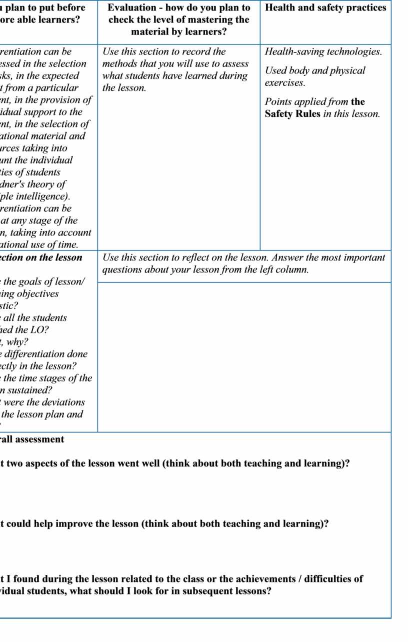 Were the goals of lesson/ learning objectives realistic? Have all the students reached the LO? If not, why? Is the differentiation done correctly in the lesson? Were the time stages of the lesson sustained? What were the deviations from the lesson plan and why? |