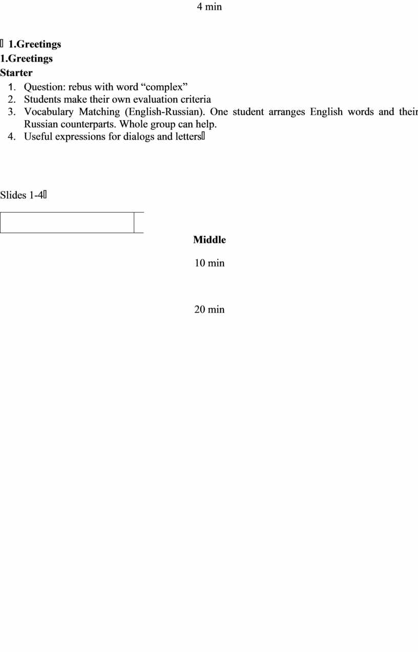1.Greetings Starter 1. Question: rebus with word “complex” 2. Students make their own evaluation criteria 3. Vocabulary Matching (English-Russian). One student arranges English words and their Russian counterparts. Whole group can help. 4. Useful expressions for dialogs and letters |
