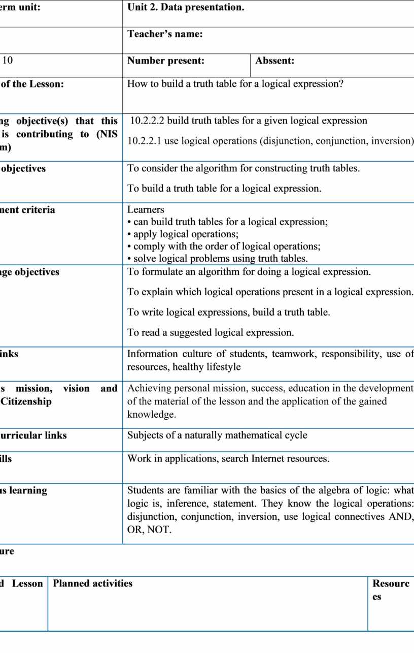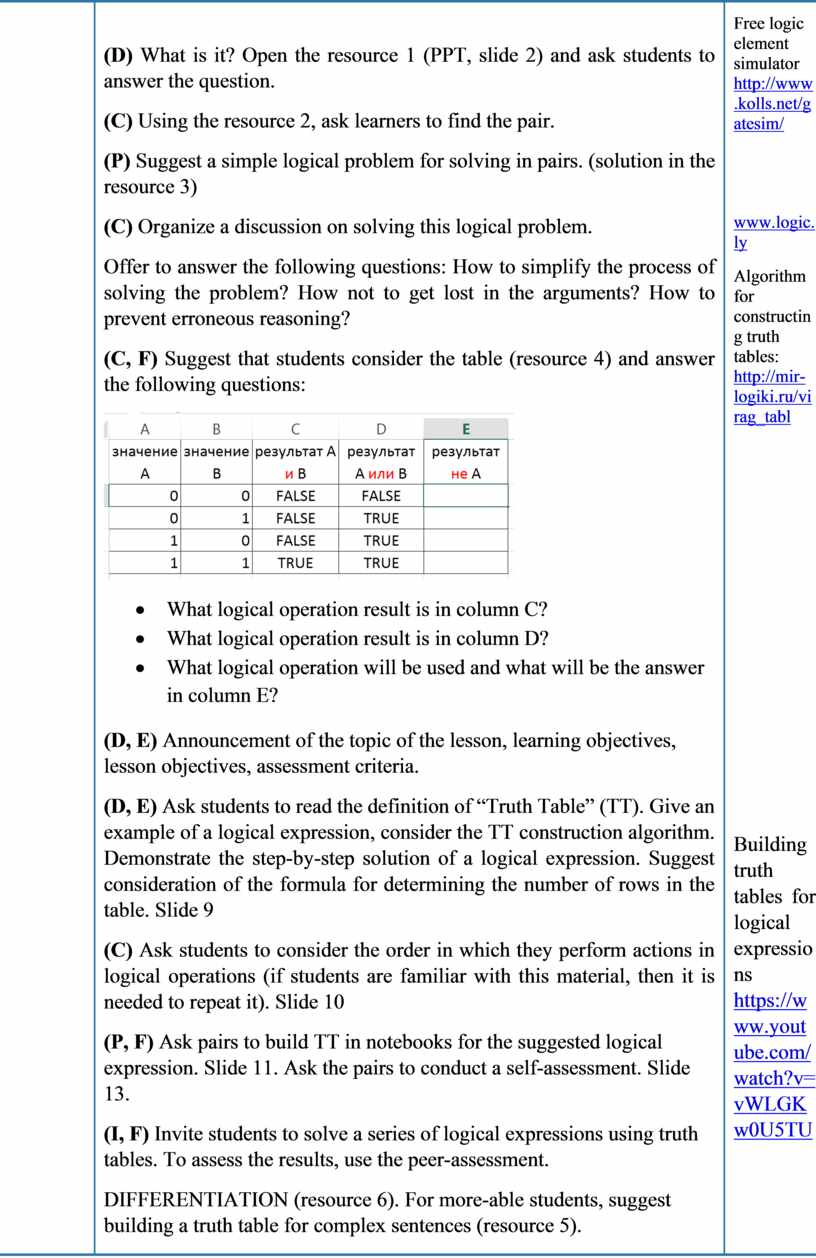 · What logical operation result is in column C? · What logical operation result is in column D? · What logical operation will be used and what will be the answer in column E? (D, E) Announcement of the topic of the lesson, learning objectives, lesson objectives, assessment criteria. (D, E) Ask students to read the definition of “Truth Table” (TT). Give an example of a logical expression, consider the TT construction algorithm. Demonstrate the step-by-step solution of a logical expression. Suggest consideration of the formula for determining the number of rows in the table. Slide 9 (C) Ask students to consider the order in which they perform actions in logical operations (if students are familiar with this material, then it is needed to repeat it). Slide 10 (P, F) Ask pairs to build TT in notebooks for the suggested logical expression. Slide 11. Ask the pairs to conduct a self-assessment. Slide 13. (I, F) Invite students to solve a series of logical expressions using truth tables. To assess the results, use the peer-assessment. DIFFERENTIATION (resource 6). For more-able students, suggest building a truth table for complex sentences (resource 5). |