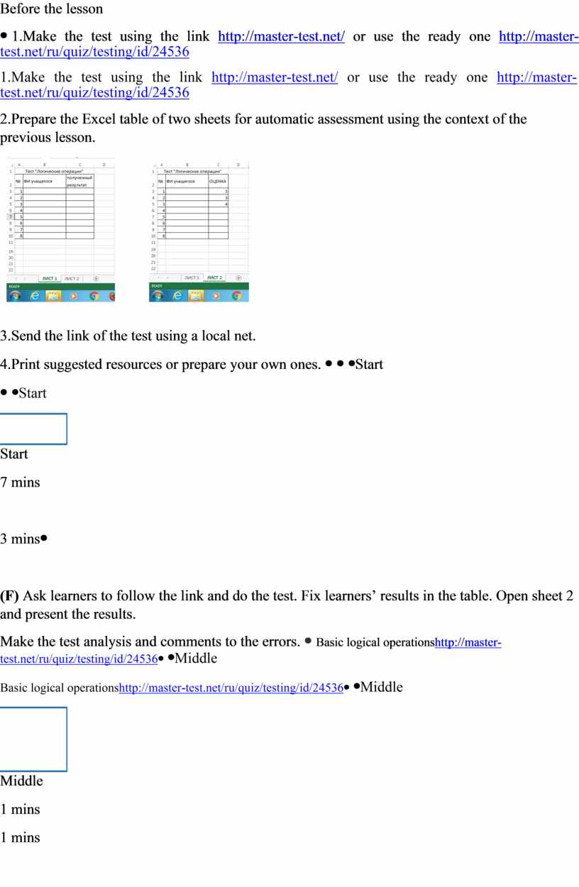 1.Make the test using the link http://master-test.net/ or use the ready one http://master-test.net/ru/quiz/testing/id/24536 2.Prepare the Excel table of two sheets for automatic assessment using the context of the previous lesson.