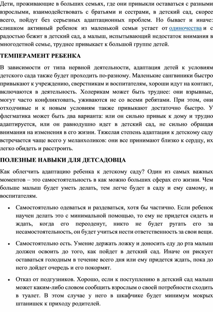 Дети, проживающие в больших семьях, где они привыкли оставаться с разными взрослыми, взаимодействовать с братьями и сестрами, в детский сад, скорее всего, пойдут без серьезных адаптационных проблем. Но бывает и иначе: слишком активный ребенок из маленькой семьи устает от одиночества и с радостью бежит в детский сад, а малыш, испытывающий недостаток внимания в многодетной семье, труднее привыкает к большой группе детей.