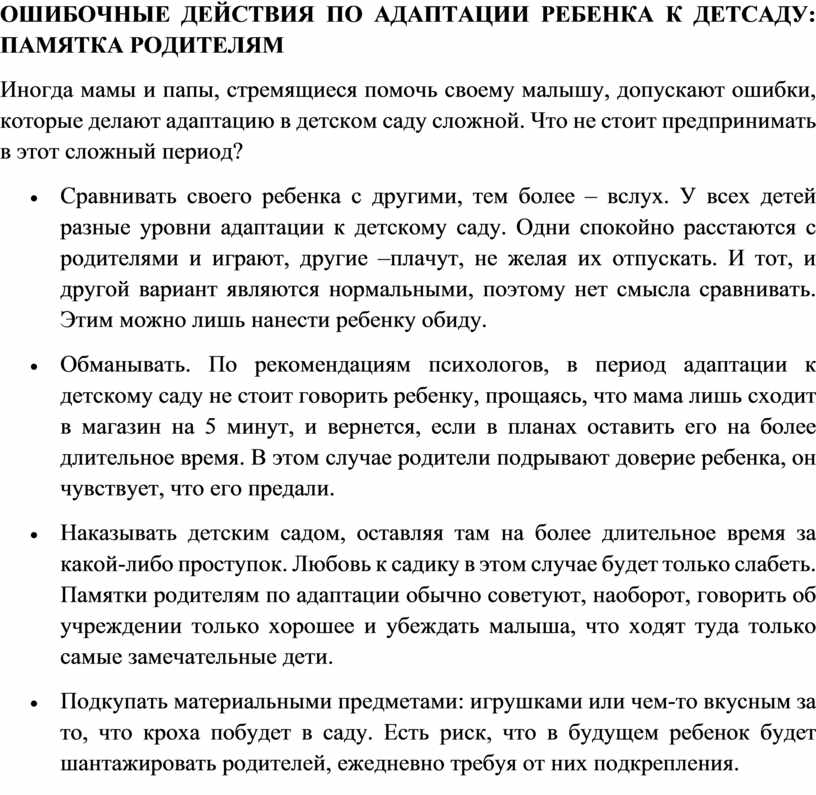ОШИБОЧНЫЕ ДЕЙСТВИЯ ПО АДАПТАЦИИ РЕБЕНКА К ДЕТСАДУ: ПАМЯТКА РОДИТЕЛЯМ