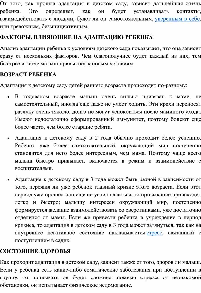 Анализ адаптации ребенка к условиям детского сада показывает, что она зависит сразу от нескольких факторов. Чем благополучнее будет каждый из них, тем быстрее и легче малыш привыкнет к новым условиям.